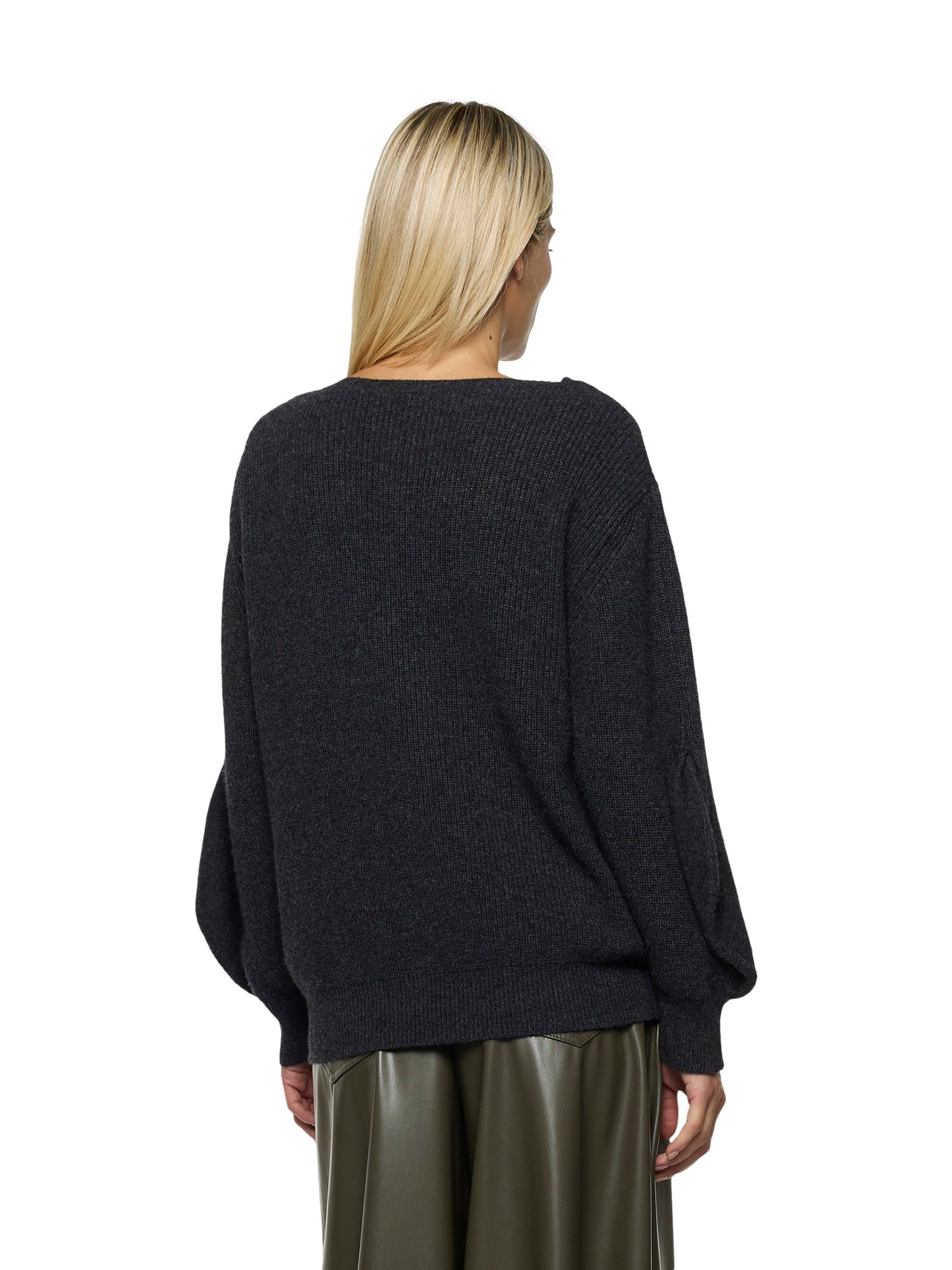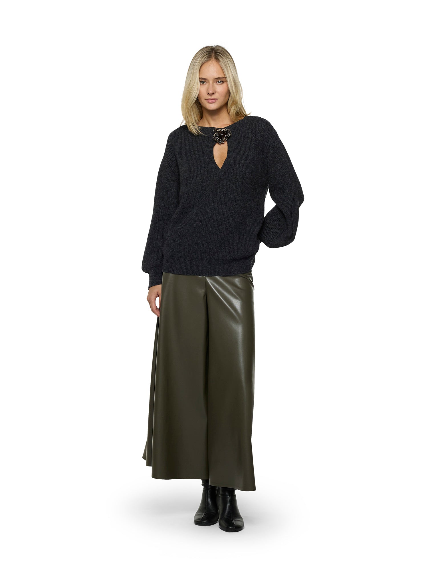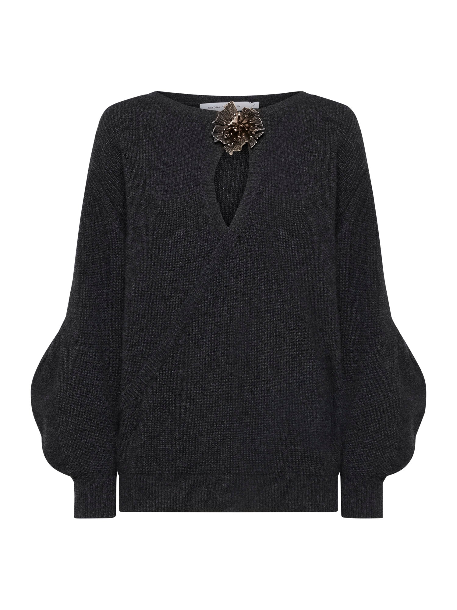 Ribbed wool-blend sweater with boat neckline. Front teardrop opening detail and embroidered flower brooch with sequins and beads. Long sleeves with balloon effect at the cuffs.