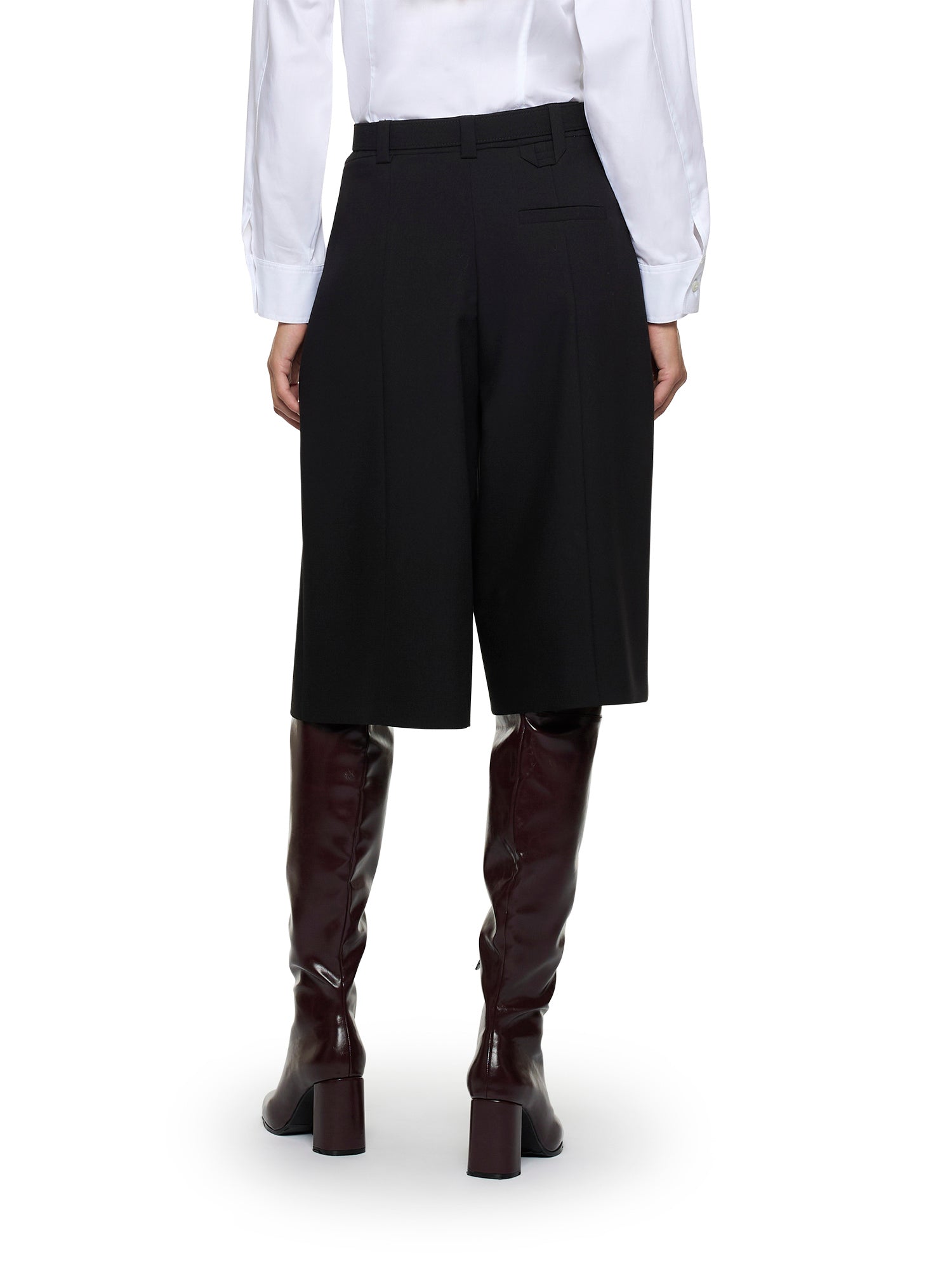 Cropped trousers in golden crepe with covered belt. Front side pockets, darts, and welt pocket at the back. Crease detail front and back. Front closure with zipper, internal button, and hook.