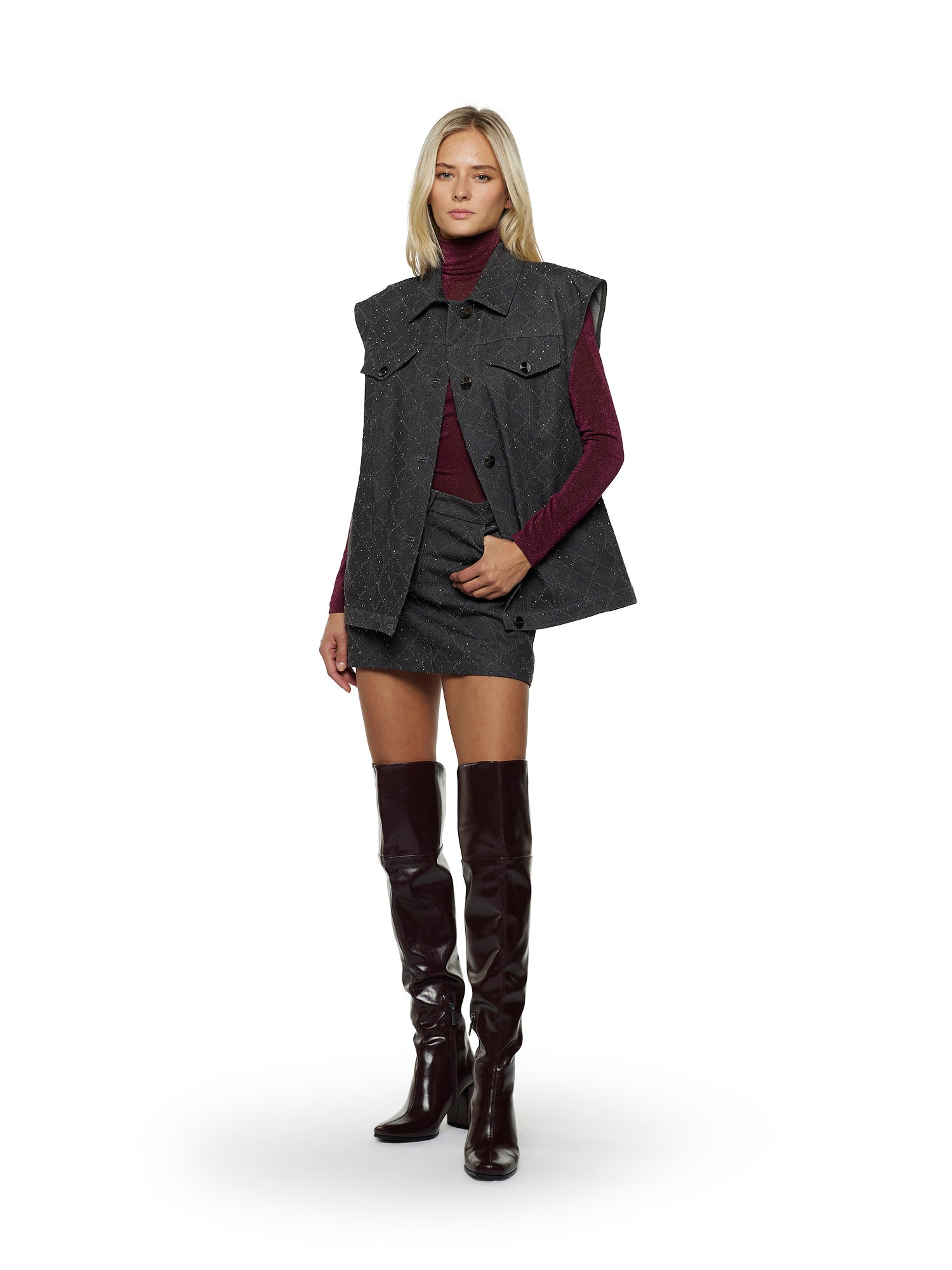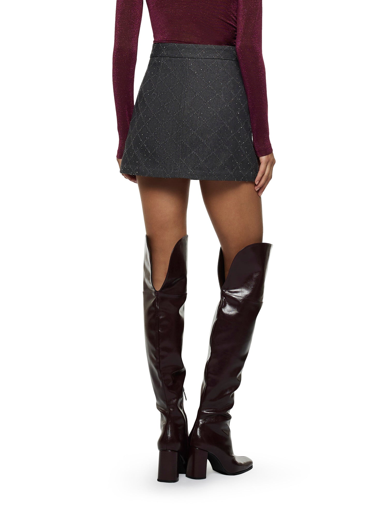 Denim miniskirt with a diamond pattern and rhinestones. Closure with placket and gunmetal logo button. Two front pockets and back darts.