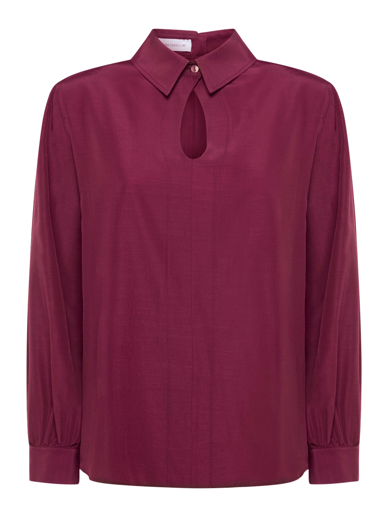 Fluid tech-fabric shirt with a front teardrop cut-out and back button closure. Long sleeves with gathered cuffs and front slit cuffs with back button closure. Internal shoulder pads.