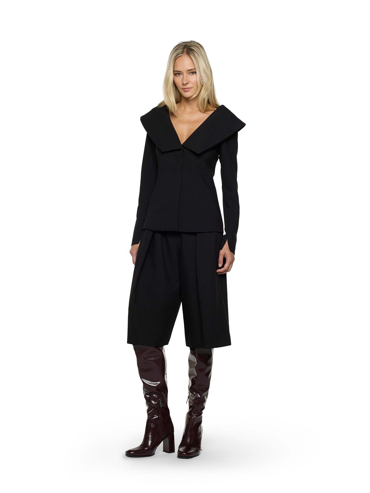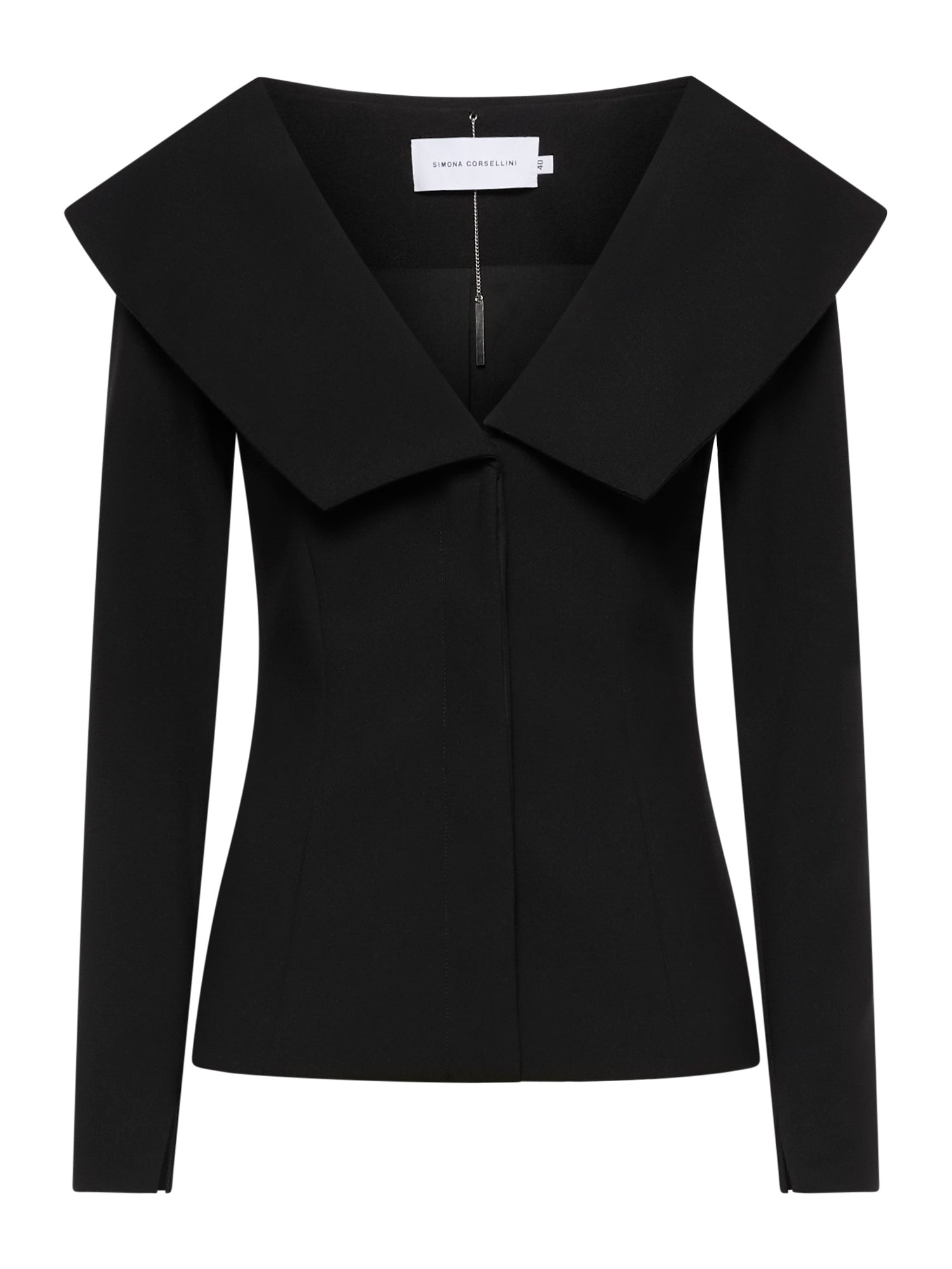 Fitted jacket in golden crepe with oversized collar. Long fitted sleeves and hidden button closure.