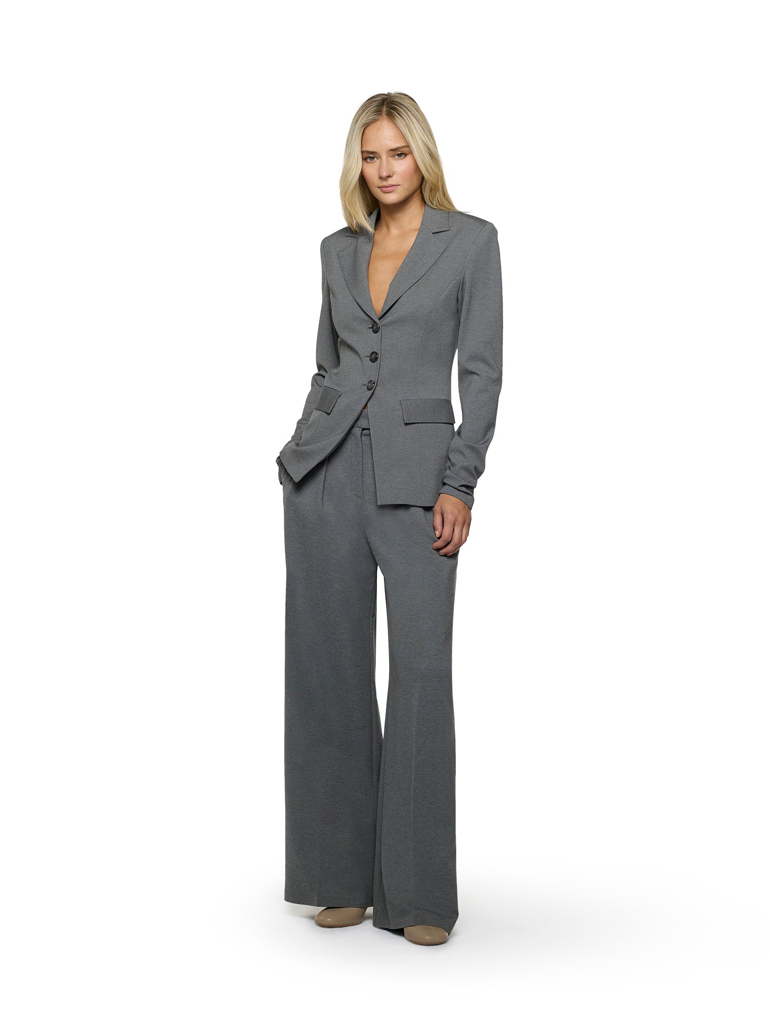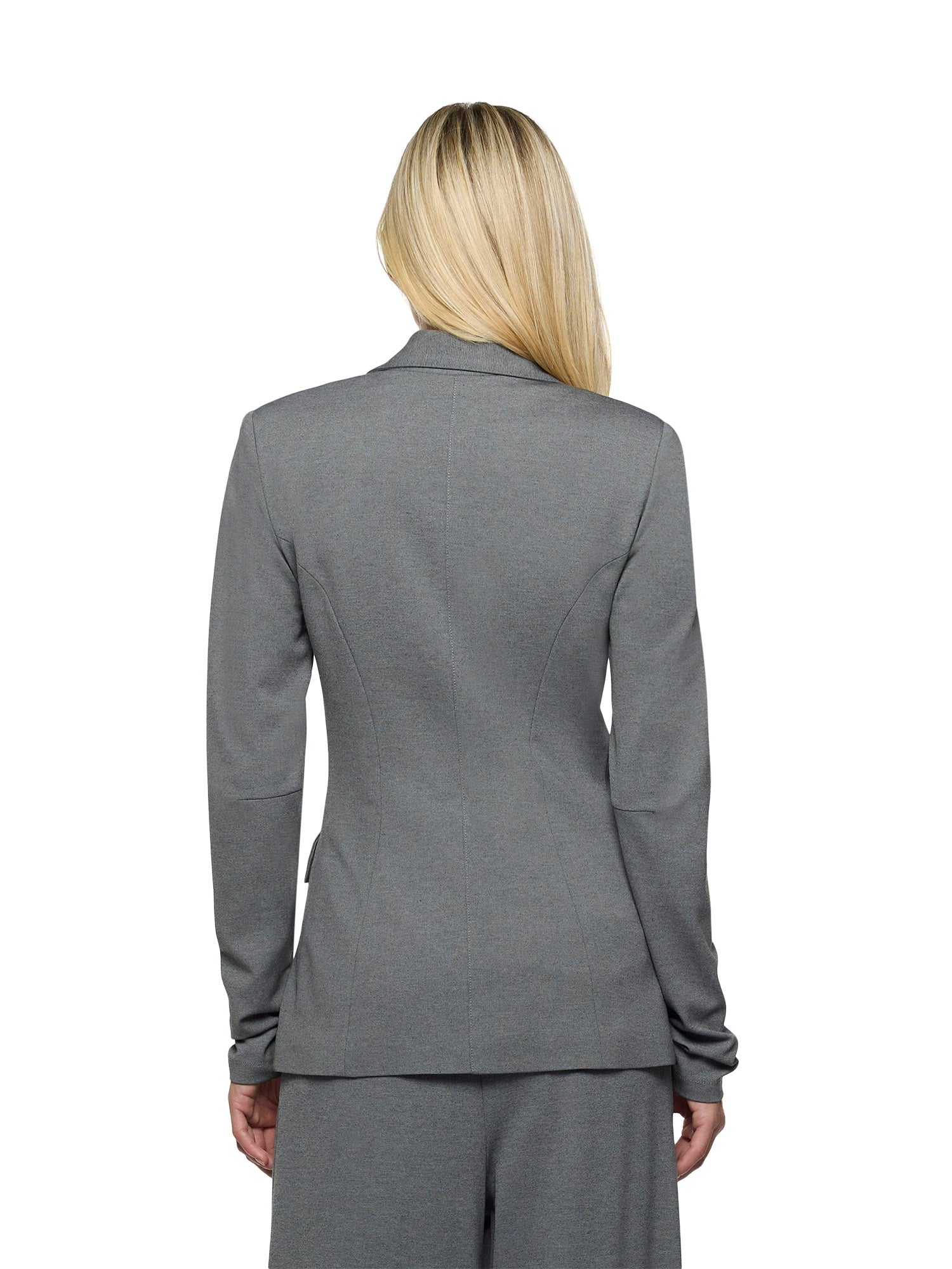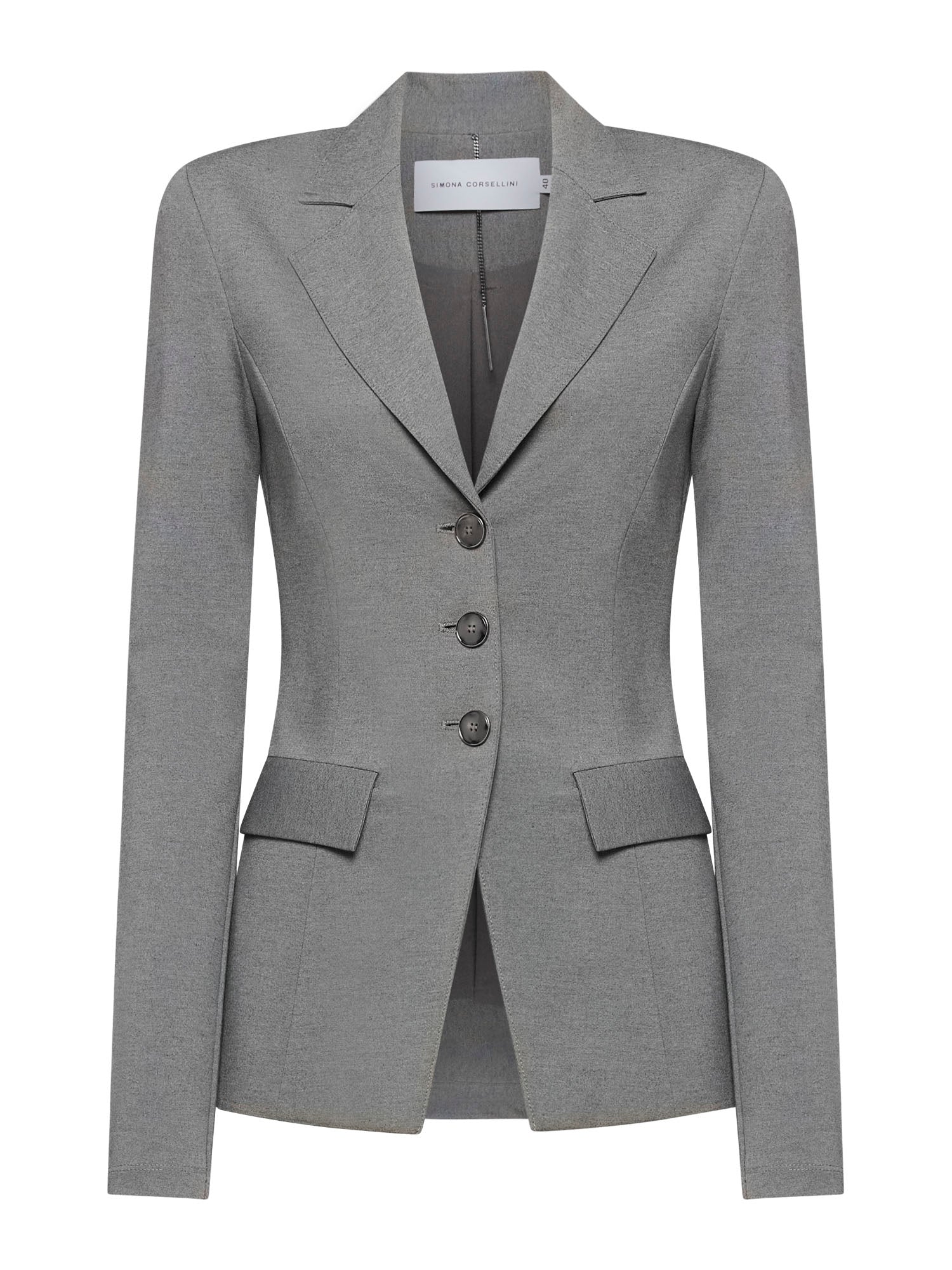 Fitted jacket with ultra-fitted long sleeves in Milano stitch. Peak lapel collar. Padded shoulders. Three-button front closure and flap pockets at the waist. Front and back darts.