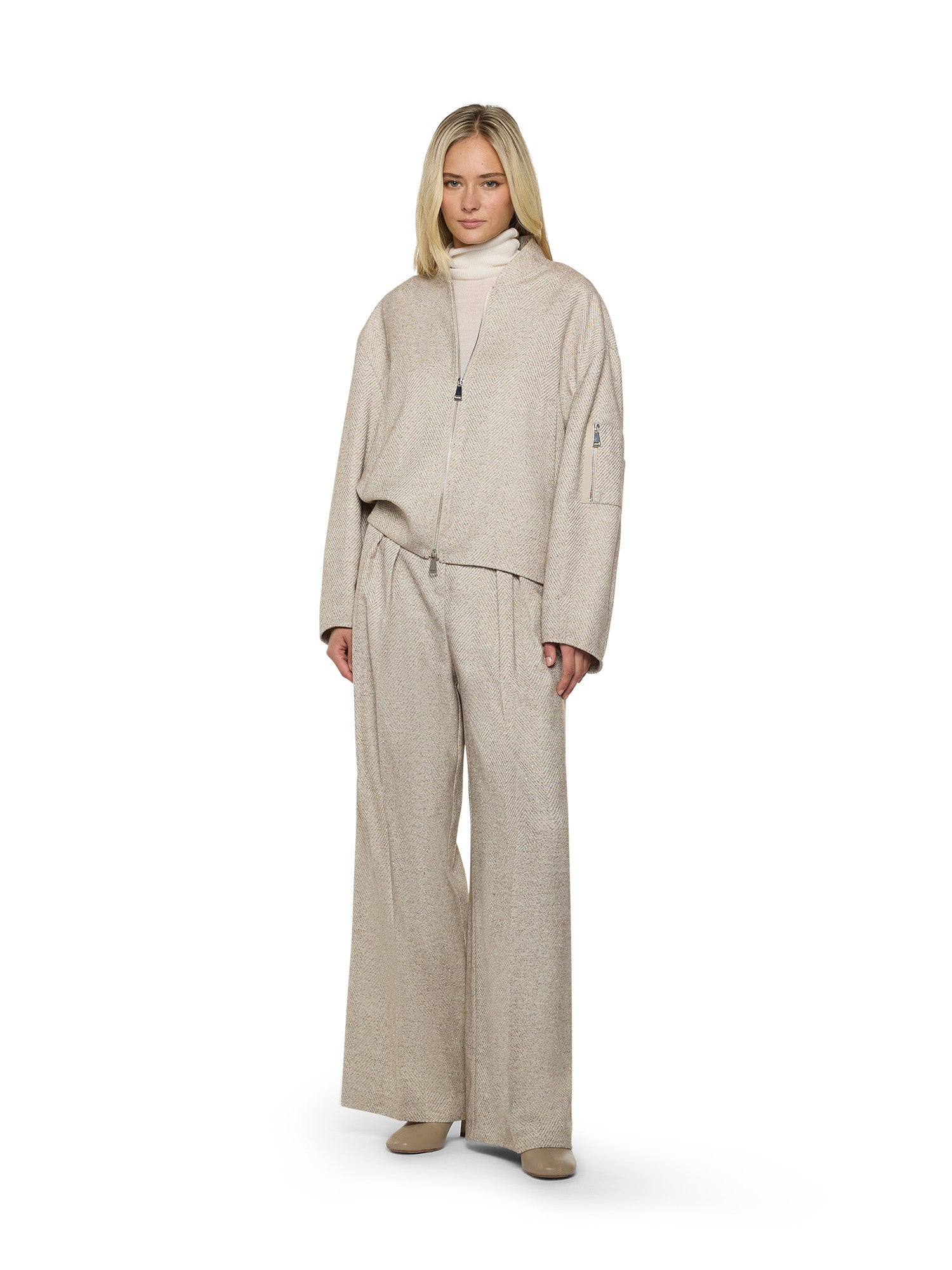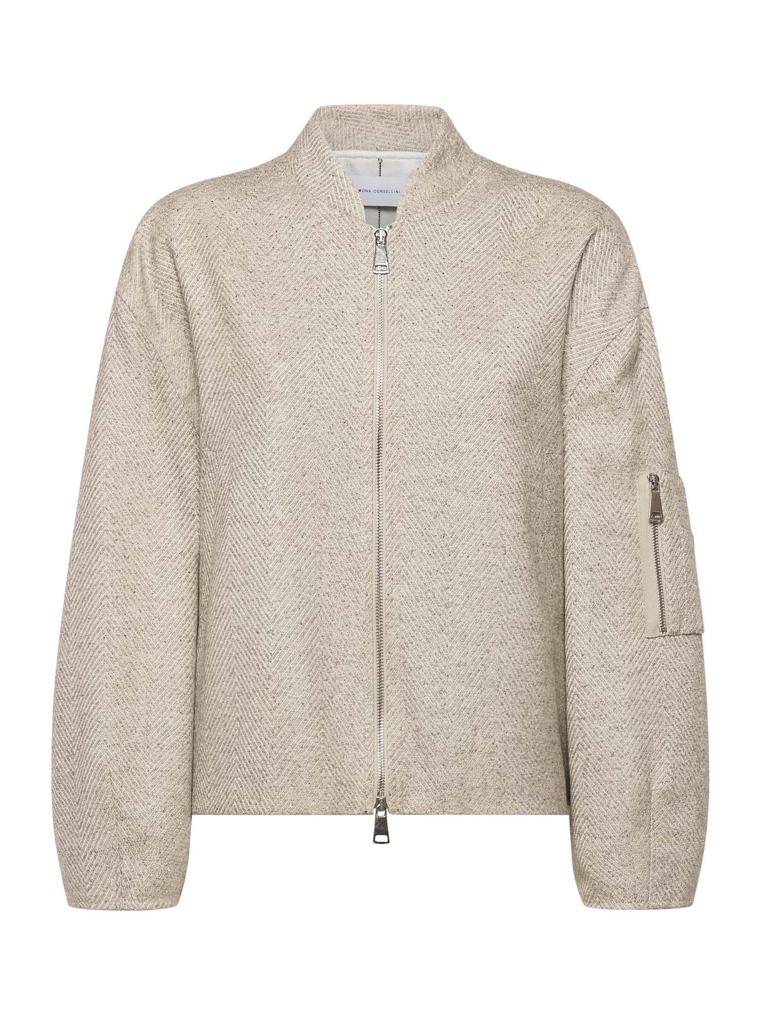 Herringbone fabric bomber jacket with rhinestones. Mandarin collar, front zip closure, and side pockets. Cuffed sleeves with darts. Yoke and elastic at the back.