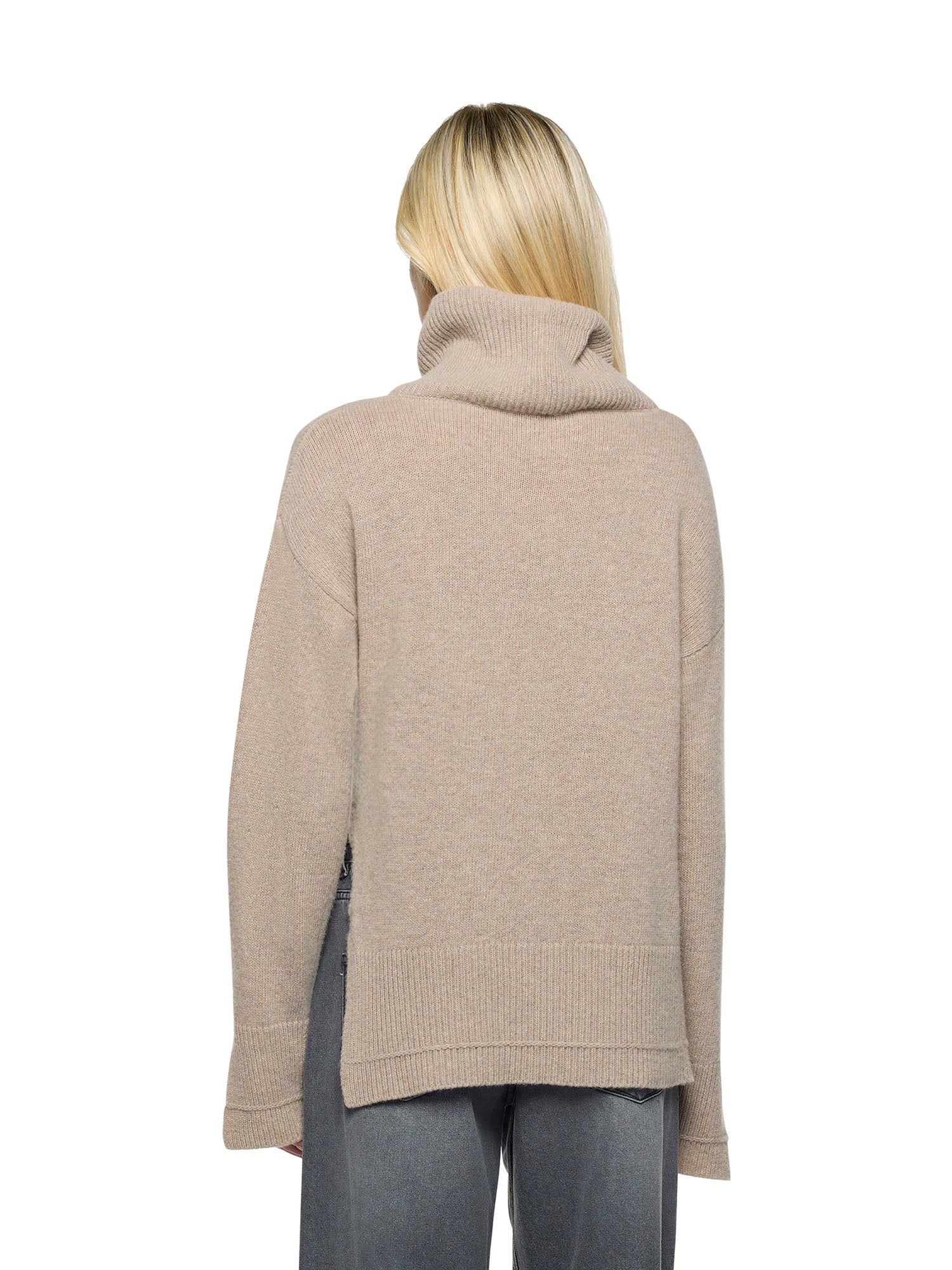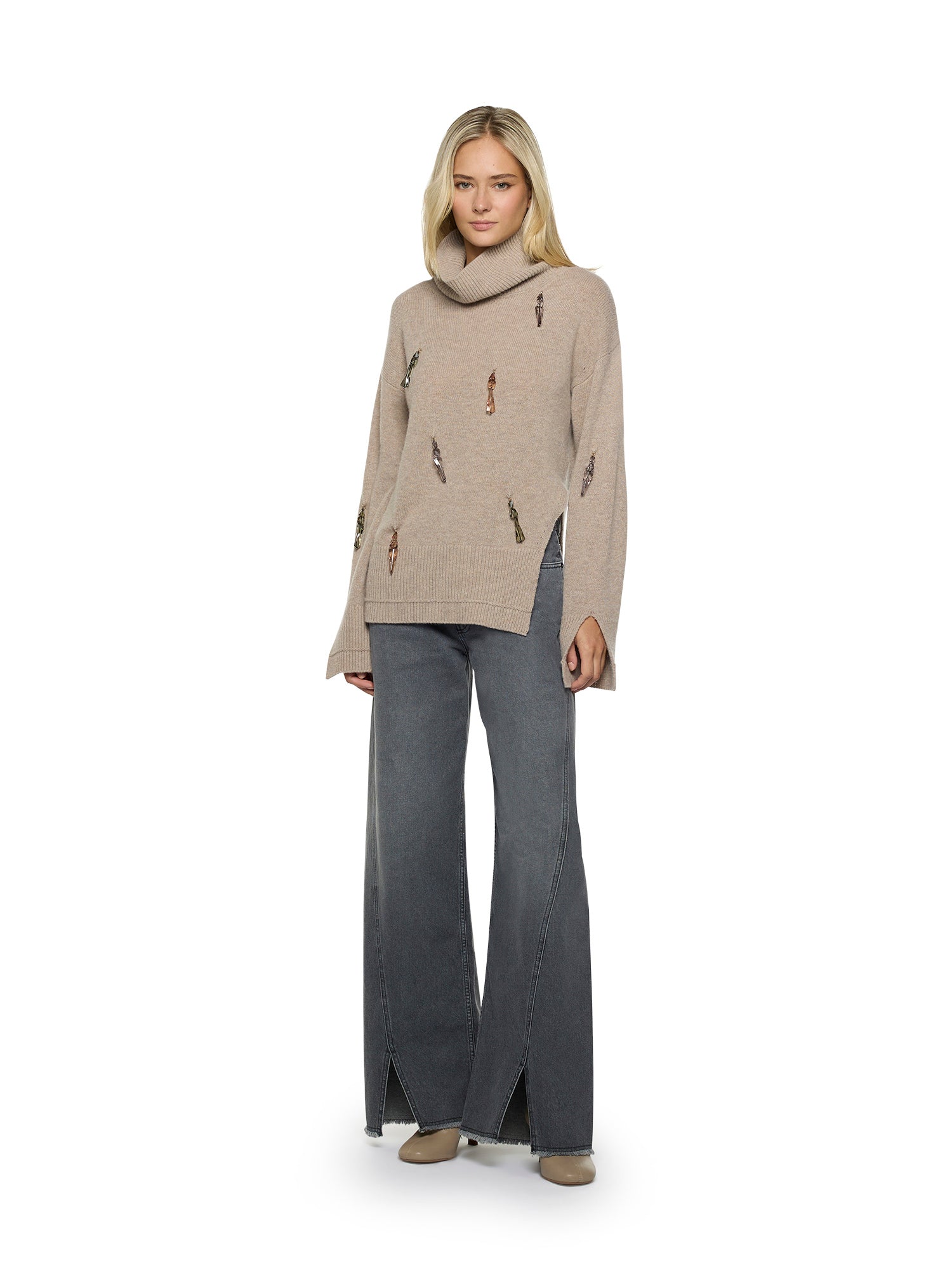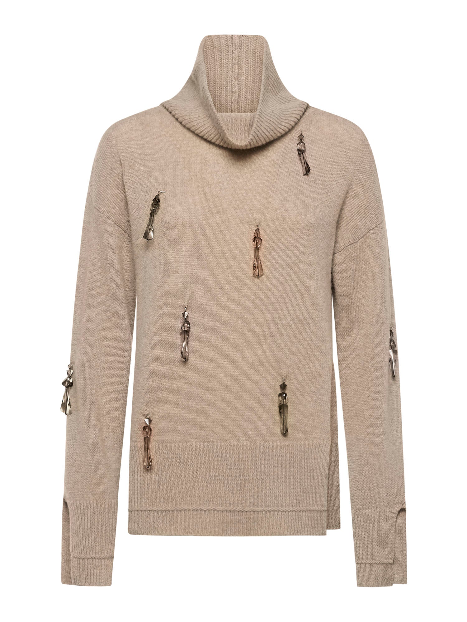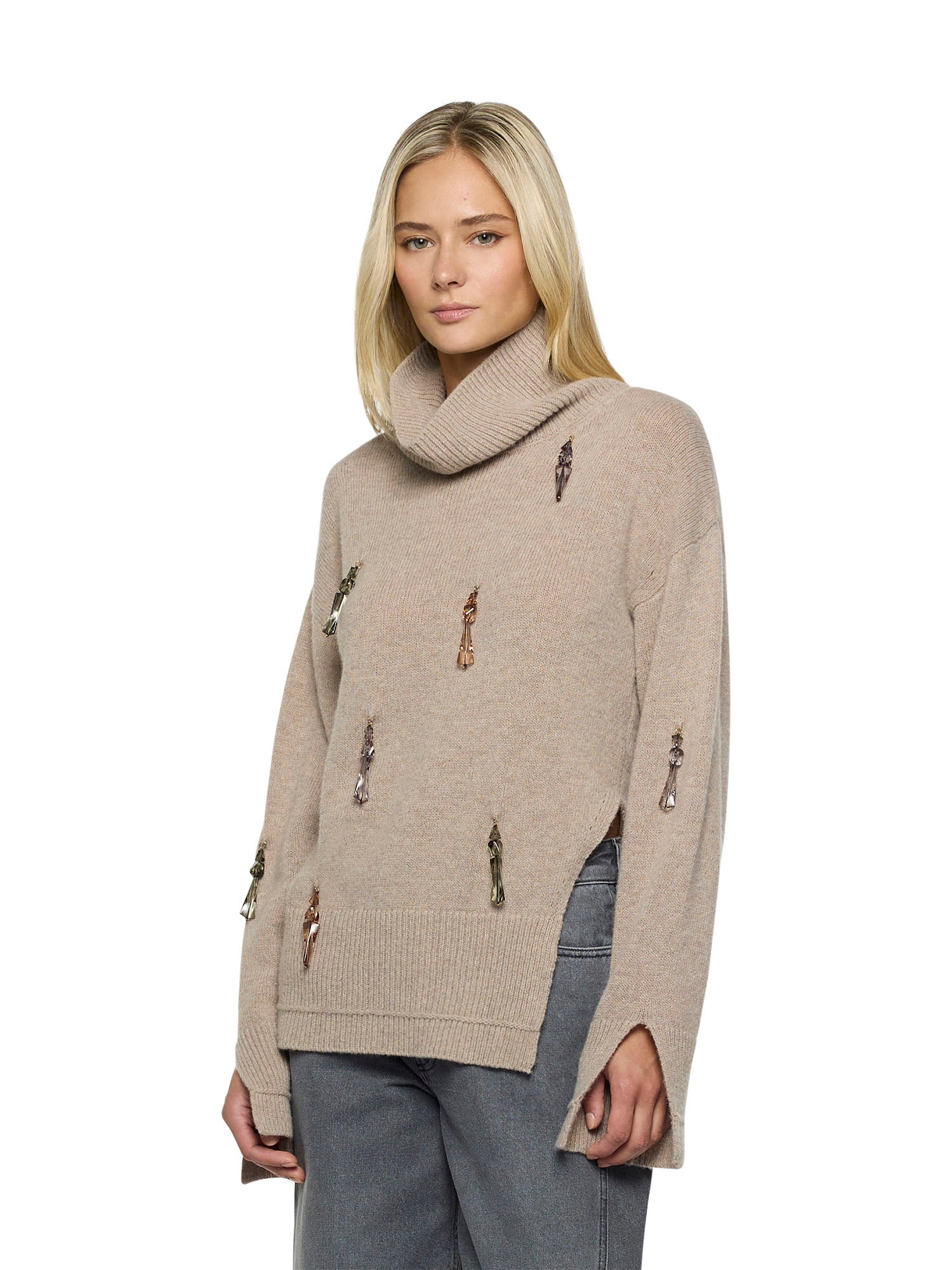 High-neck wool-blend sweater with asymmetric side slit. Long sleeves with slit cuffs and colorful dangling embellishments.