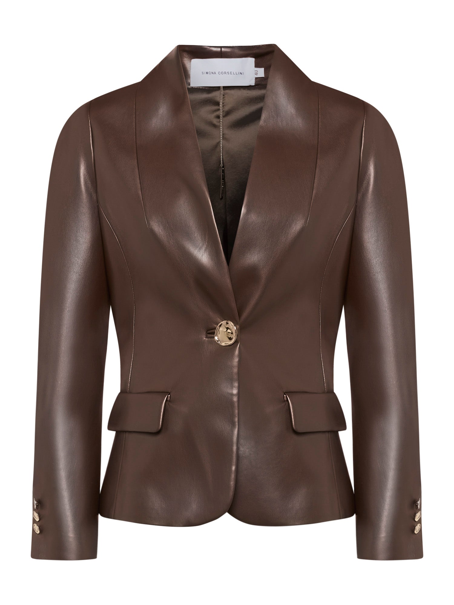 Single-breasted jacket in vegan leather with a stand-up collar and hammered gold metal button detail. Flap pockets and hammered gold metal buttons on the sleeves.