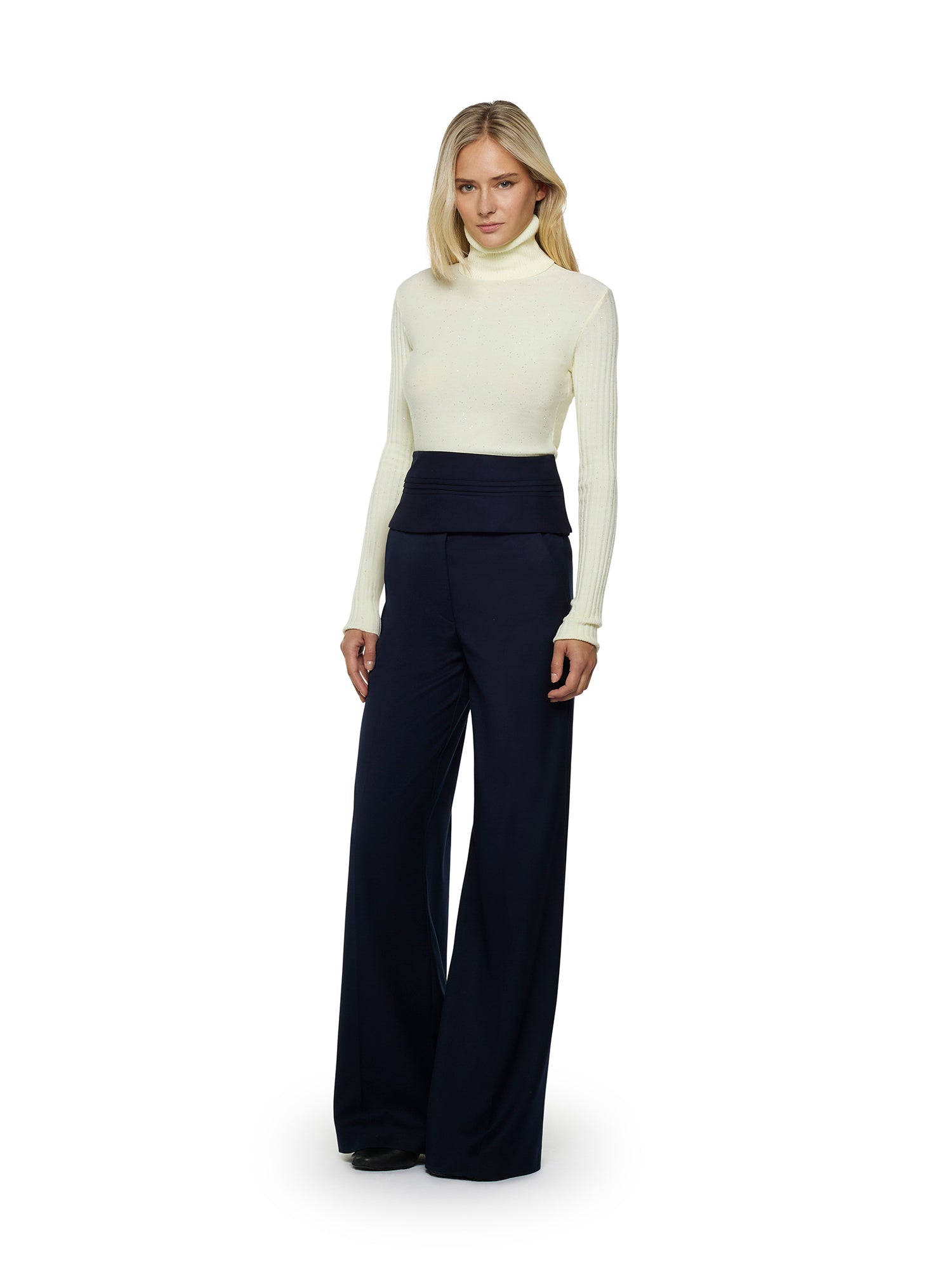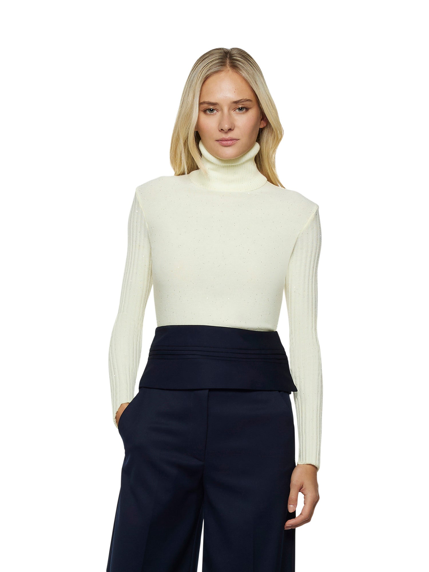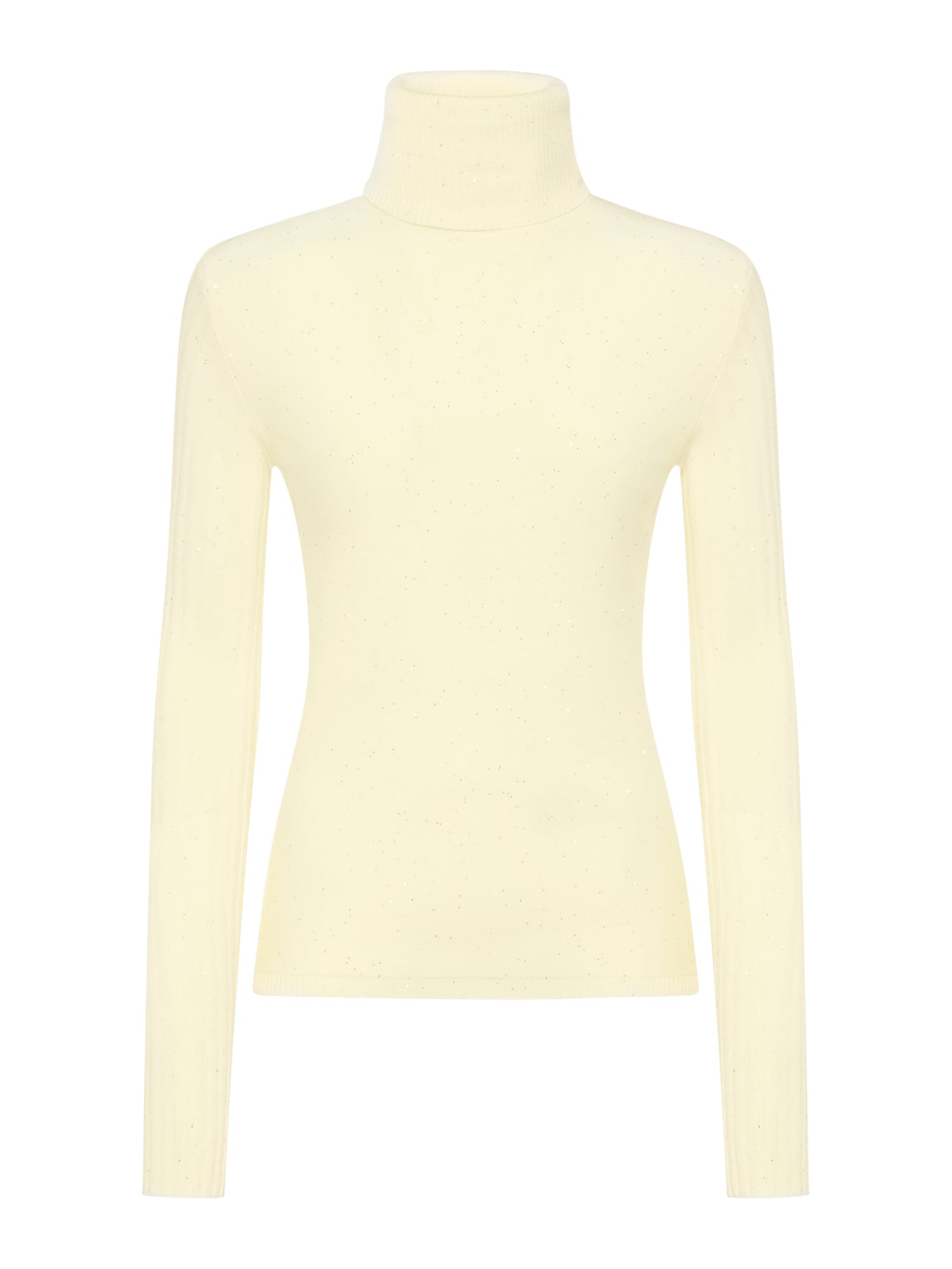 Long-sleeve turtleneck in viscose blend with straight hem and ribbed finishes.