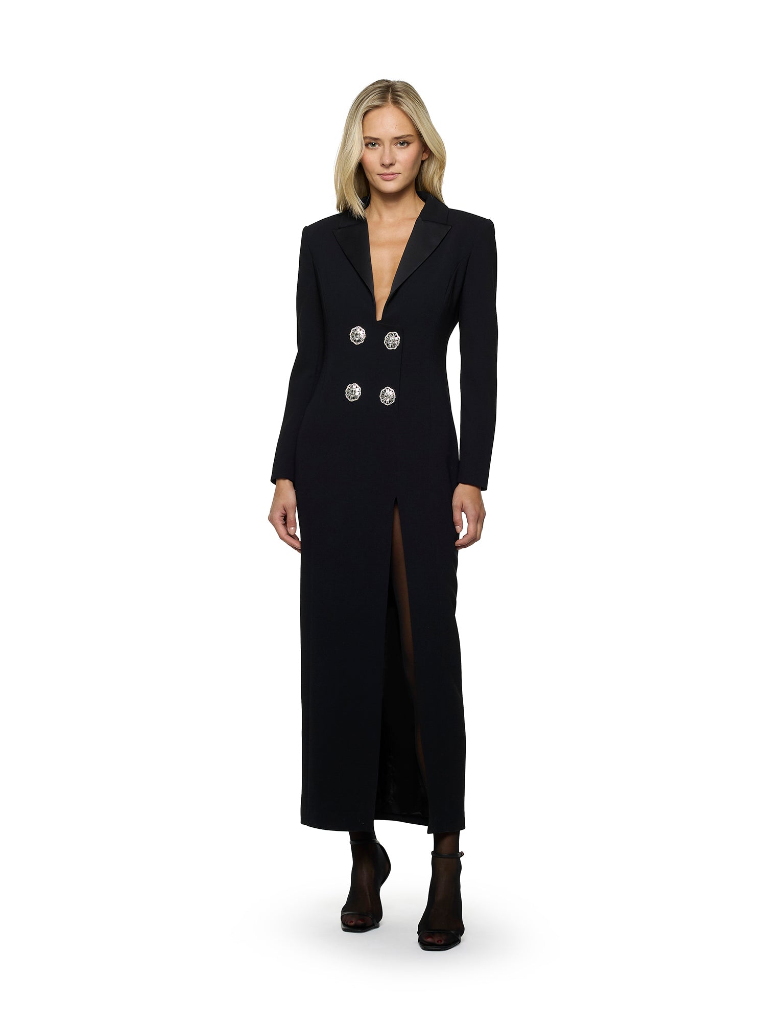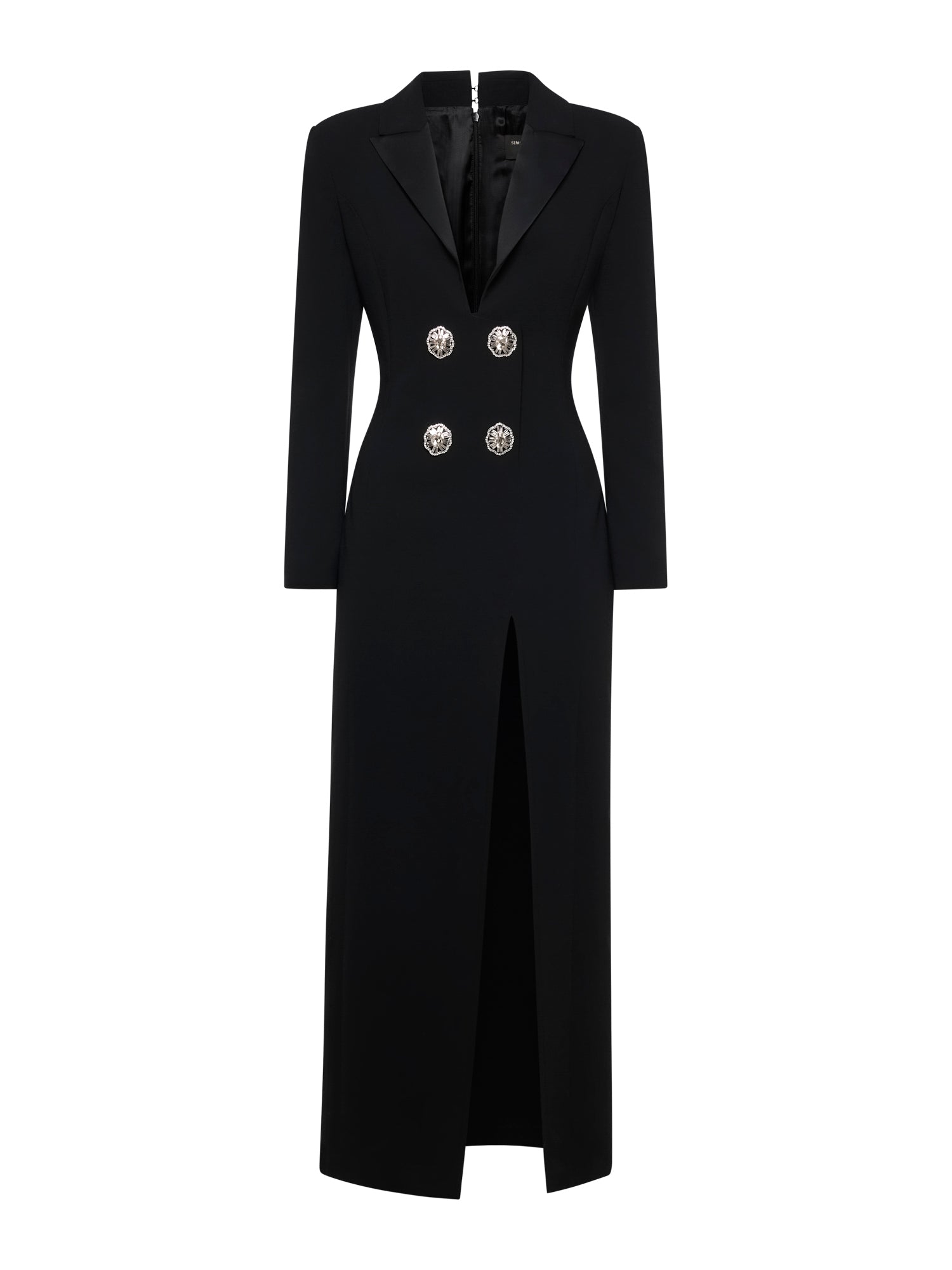 Long-sleeved satin evening dress with jeweled crystal buttons. Wide pointed lapels and deep V-neckline. Hidden back zip closure. Fitted waist, side slit, and straight hem.