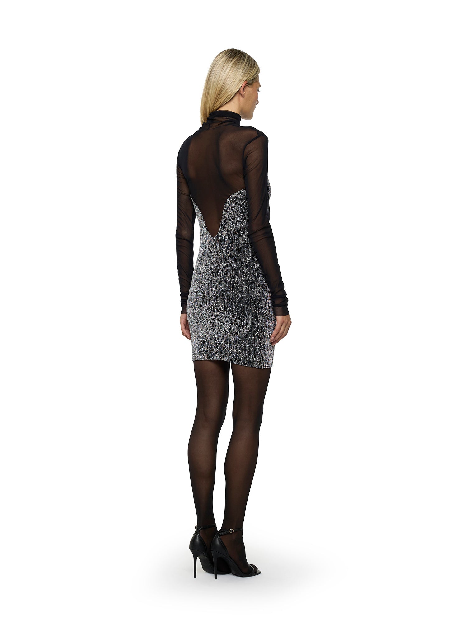 Short pencil dress with long sleeves in sparkling jersey and tulle. Deep sheer back neckline. High collar. Stretch fit.