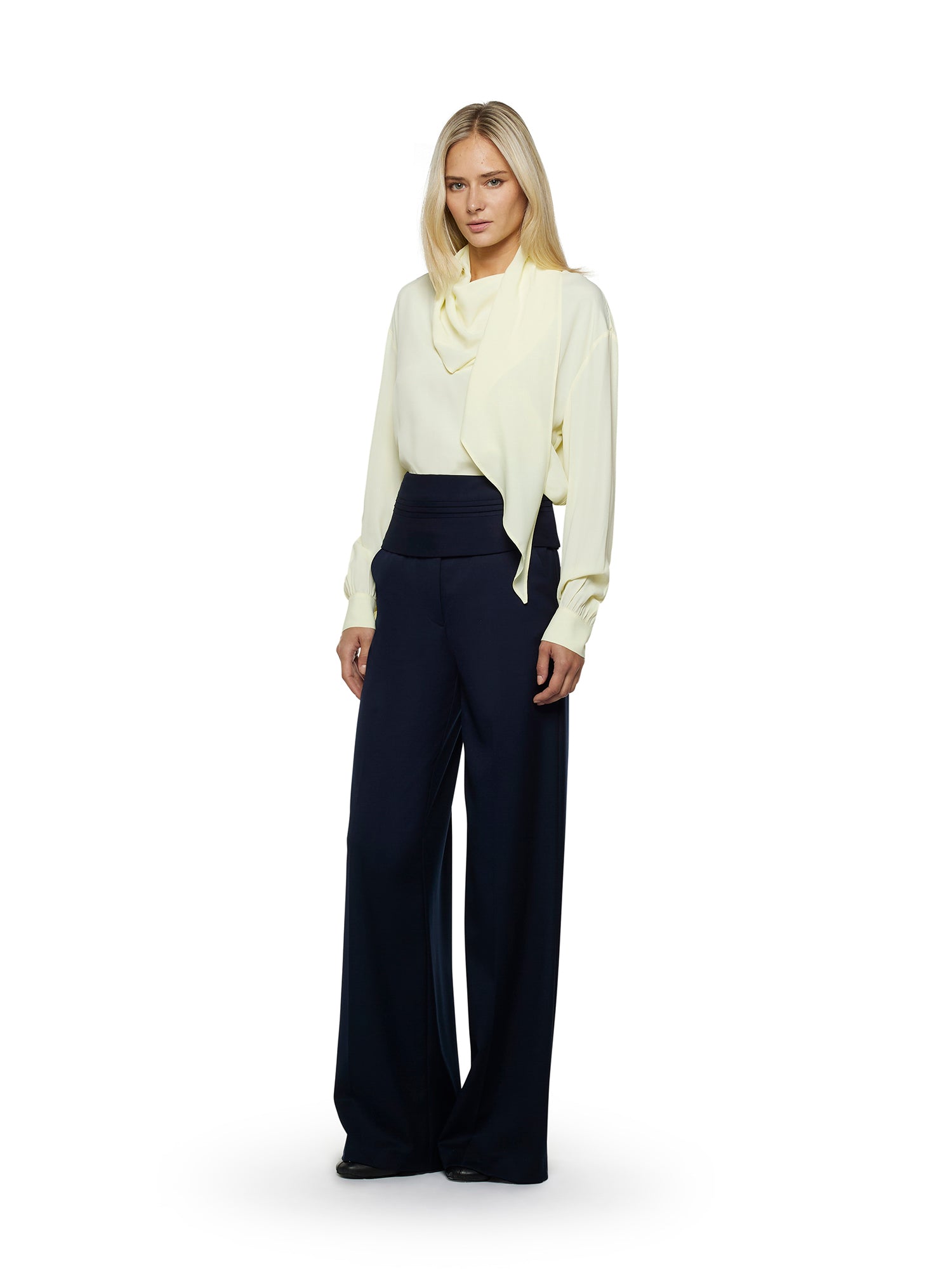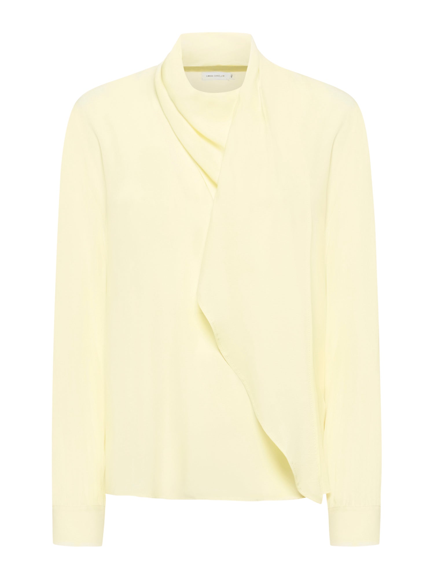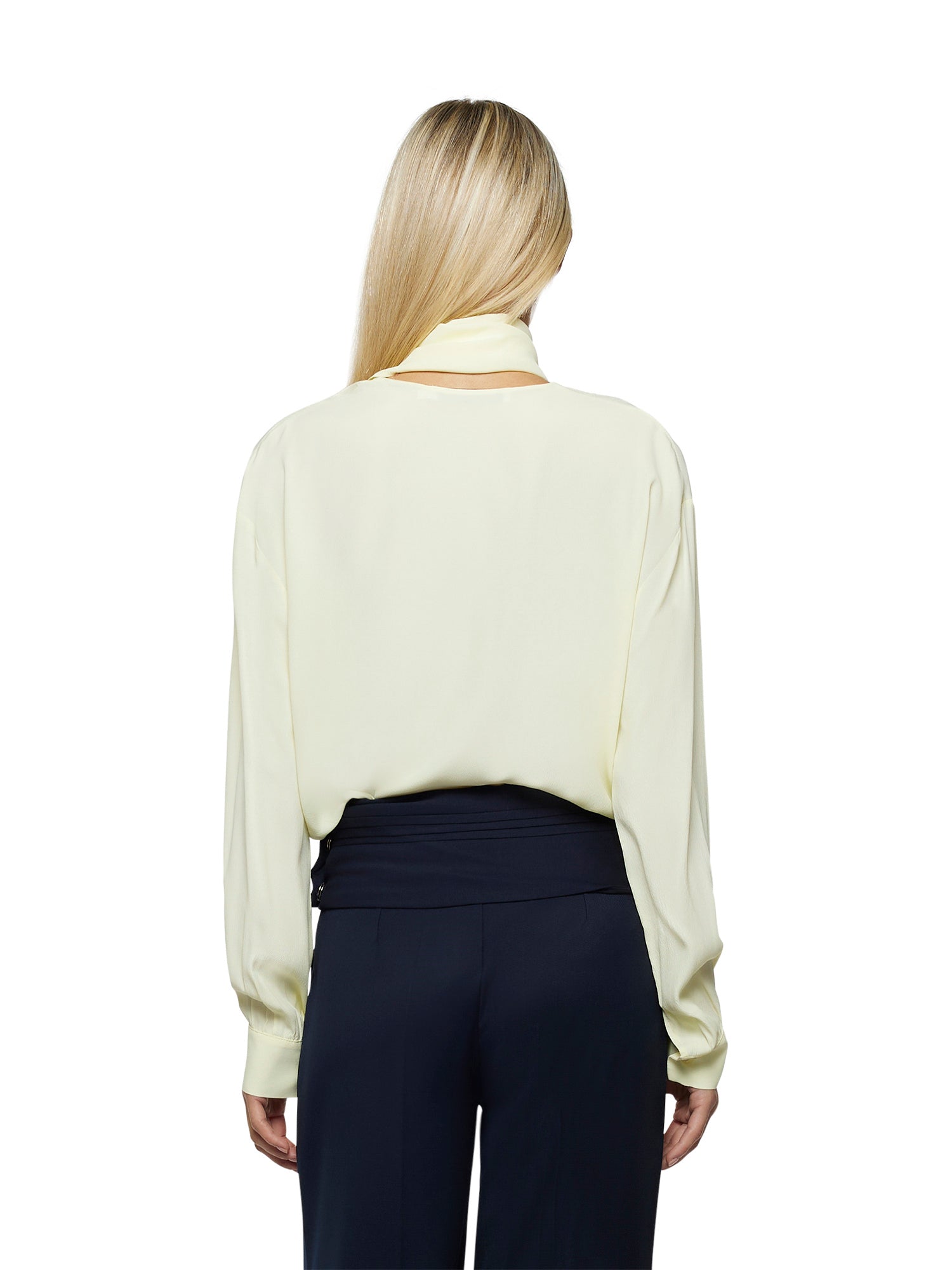 Soft silhouette acetate silk shirt with tone-on-tone scarf to wrap around the neck or drape over the shoulder. Long sleeves with cuff and back button closure.