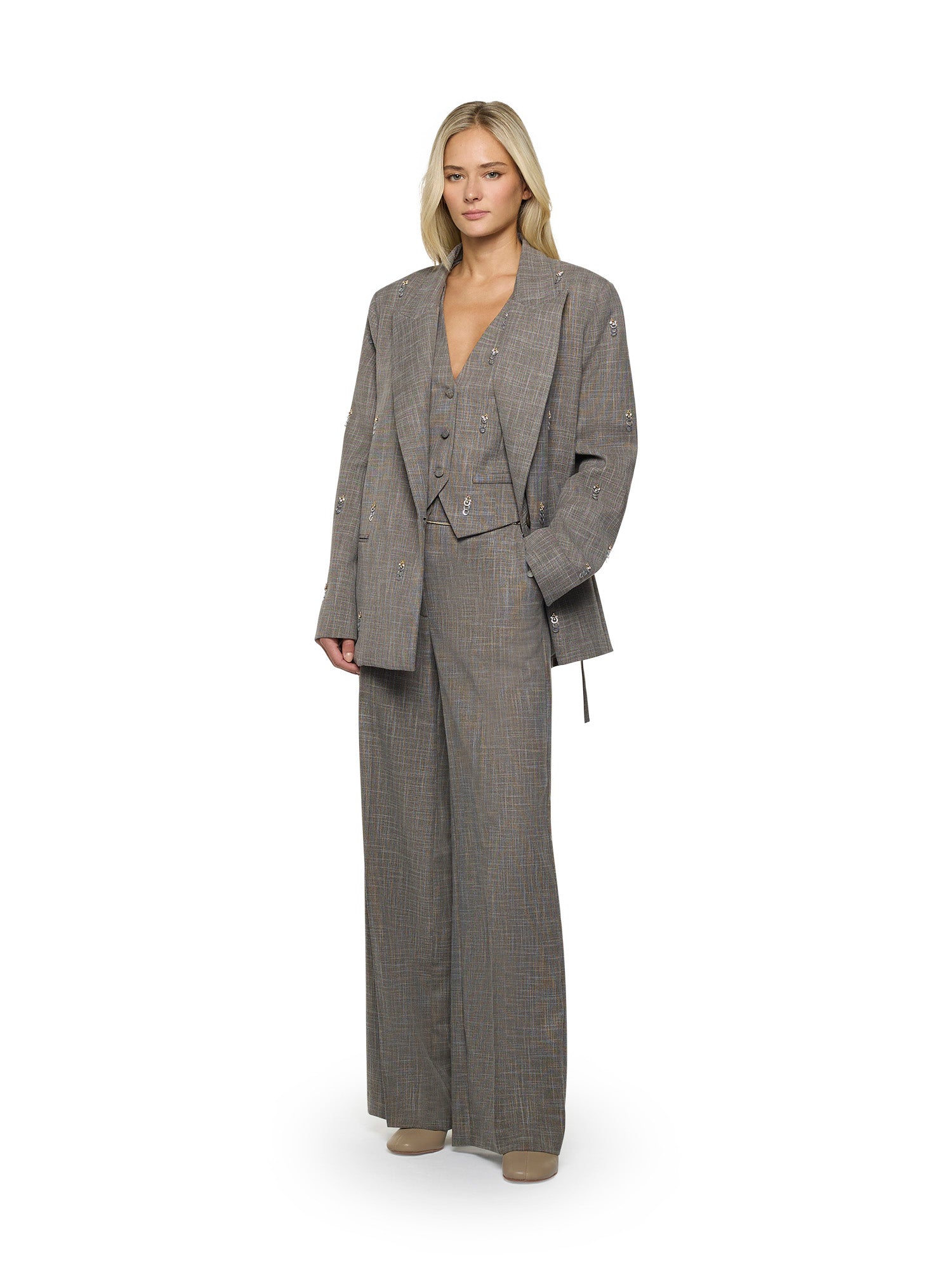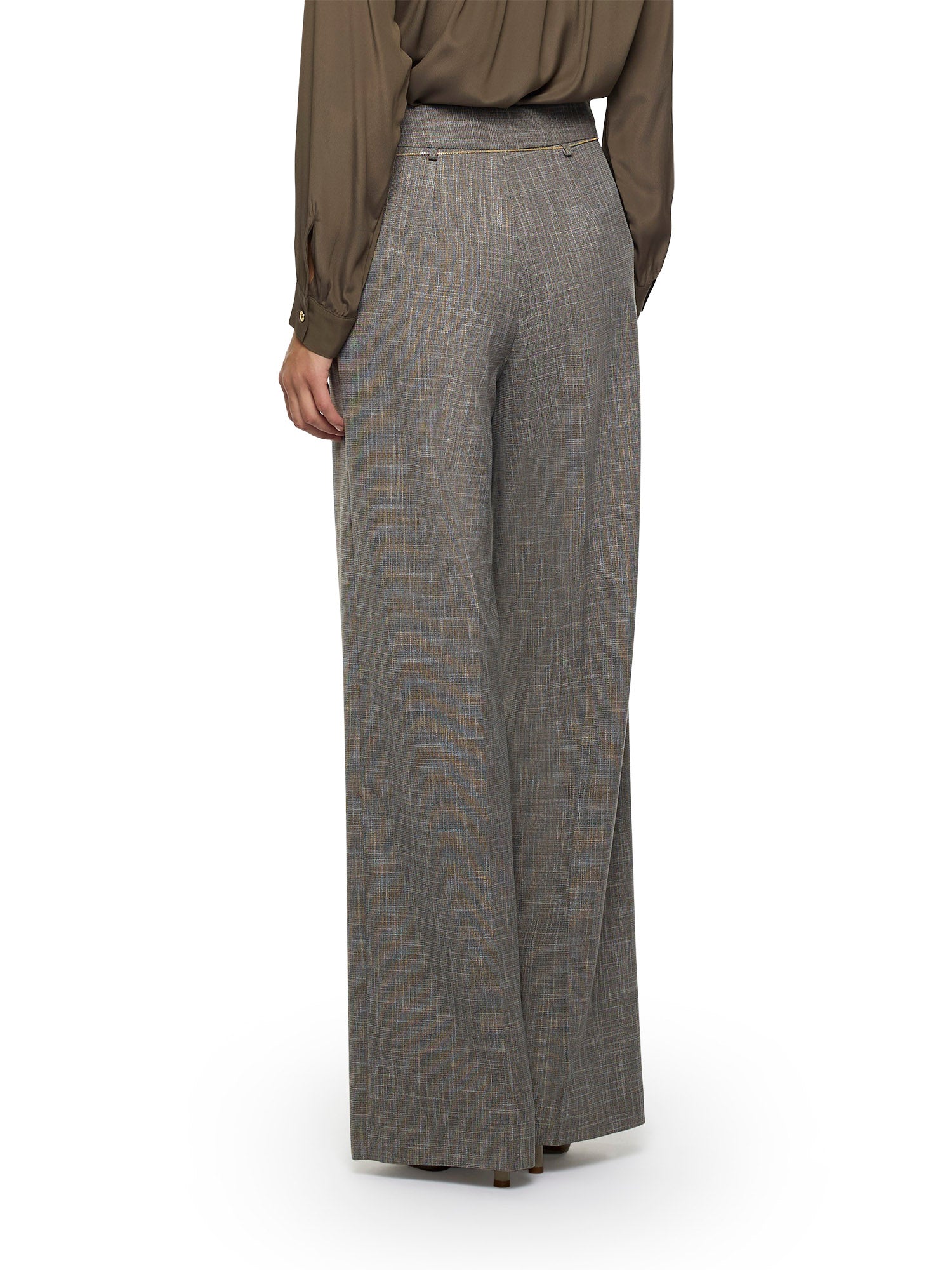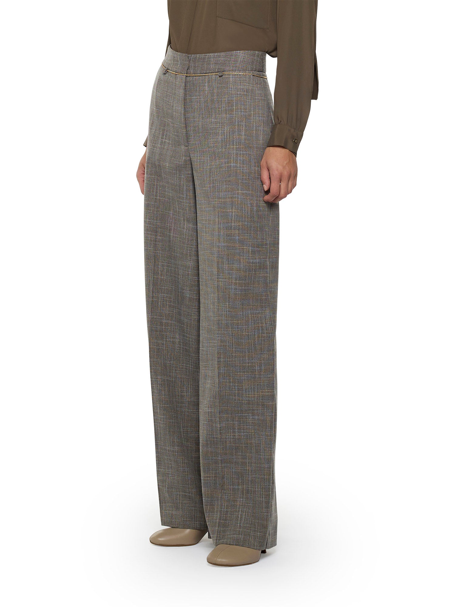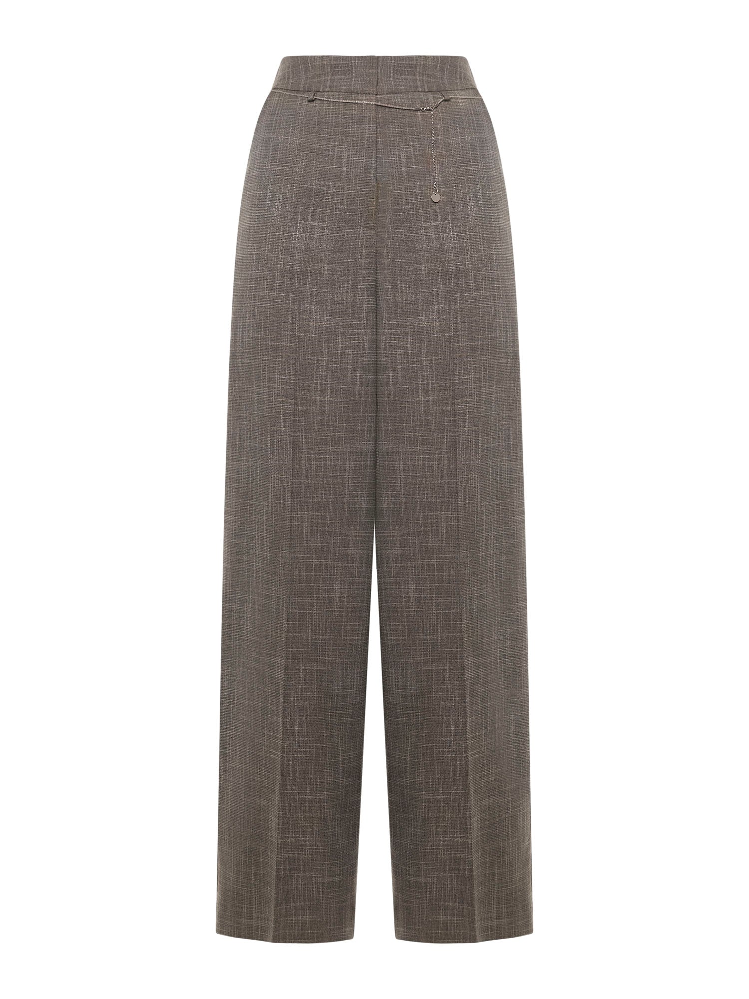 Straight-leg trousers in textured canvas with belt loops for a gold chain belt. Front closure with zipper, button, and metal hook.