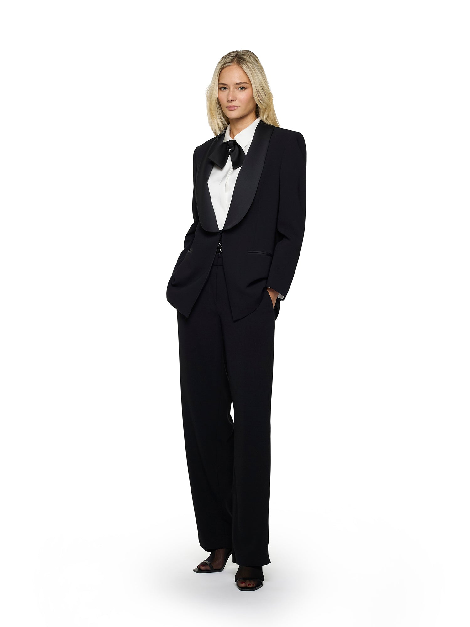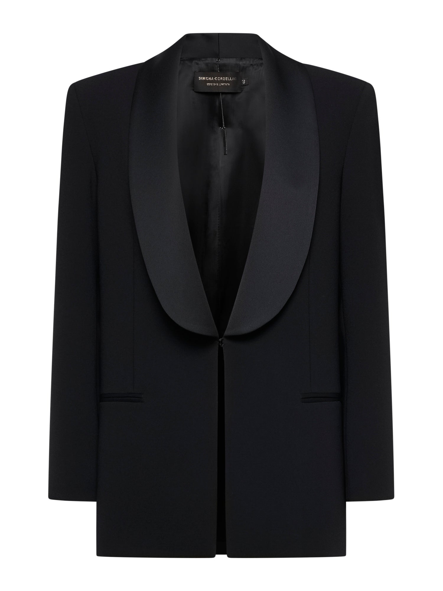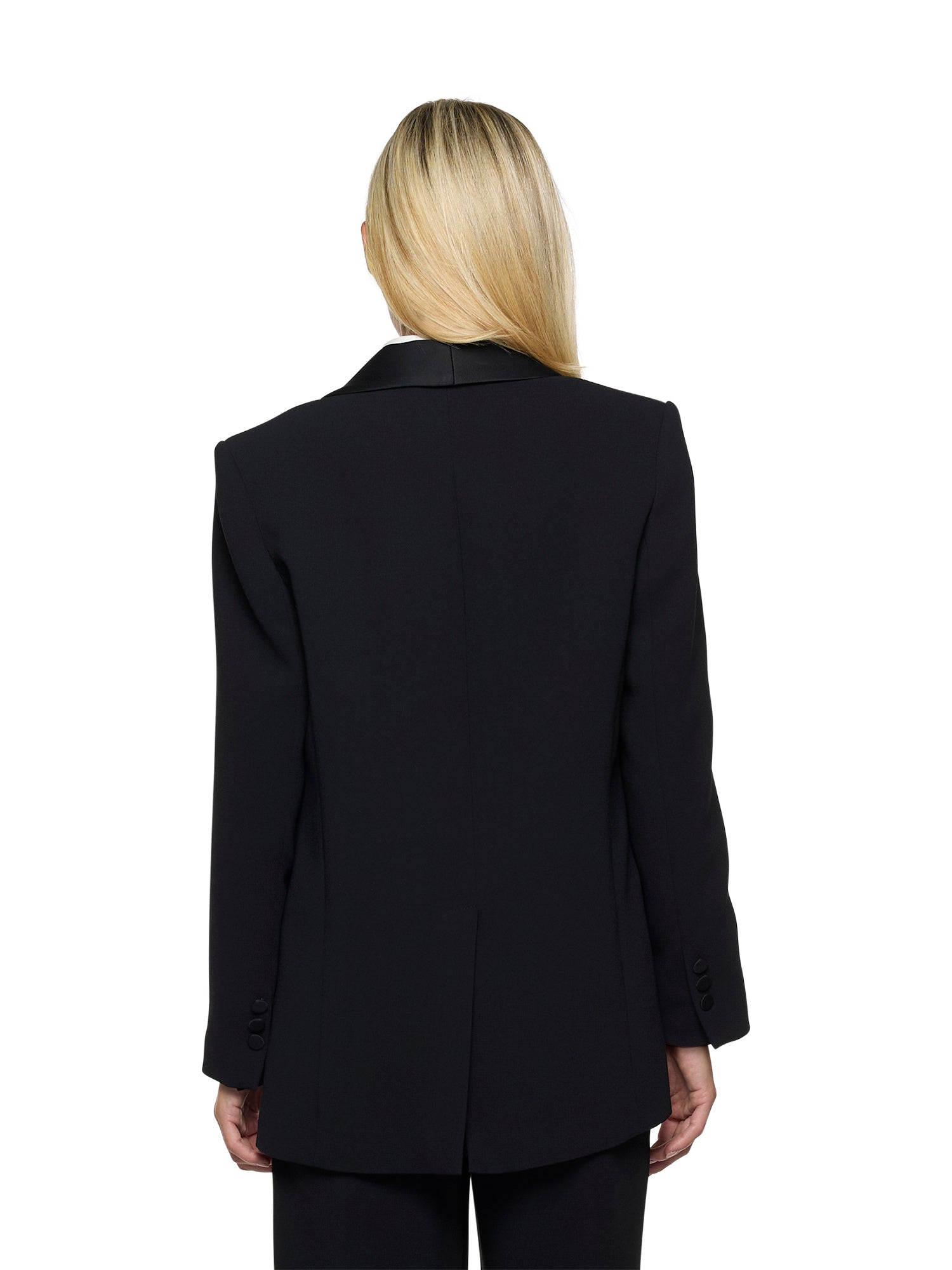 Satin tuxedo jacket with shawl collar and hook closure. Front darts with double welt pockets. Back vent at the hem and cuffs with three buttons.