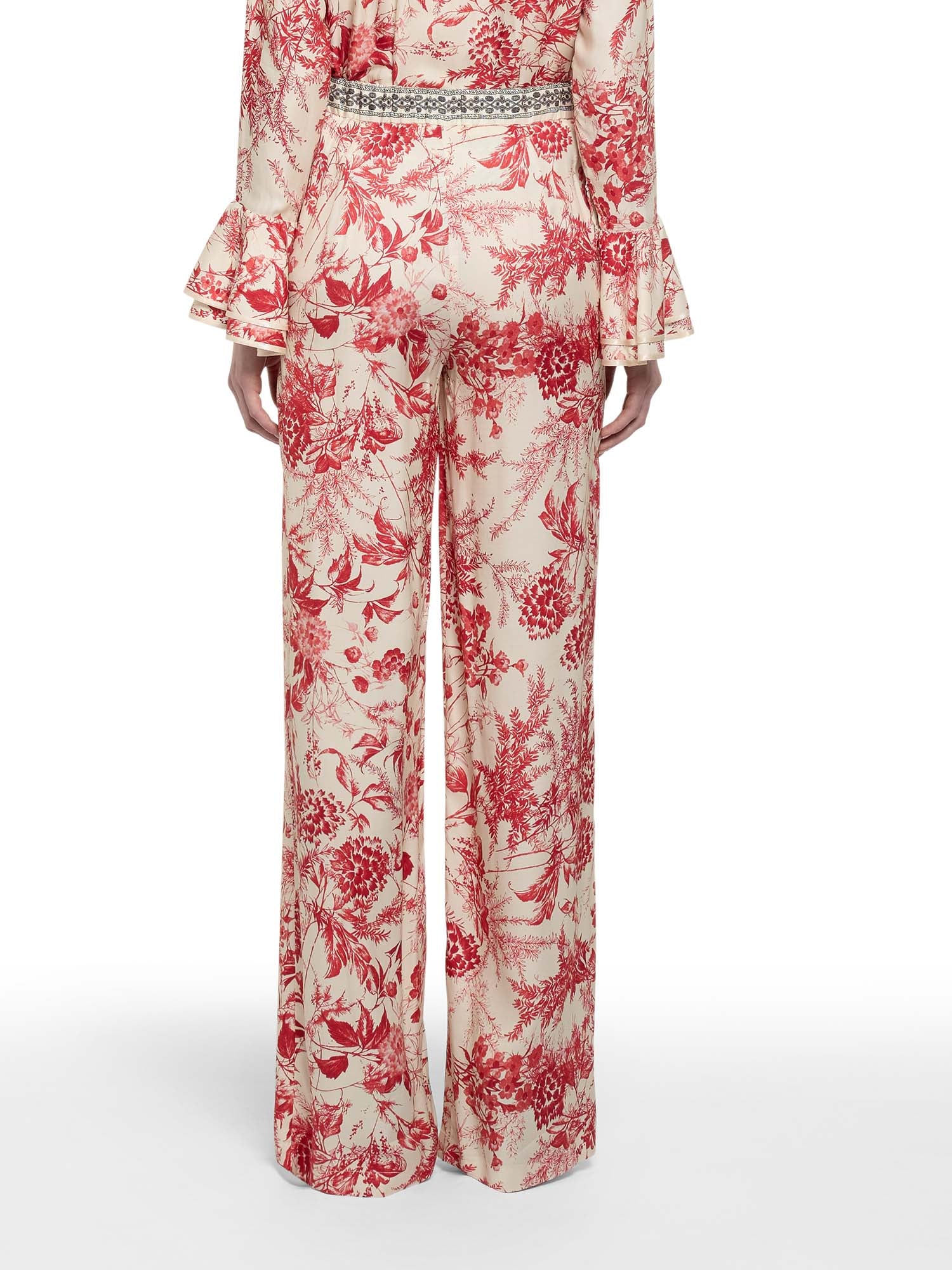 Pantalone largo in stampa flower ink con tasche alla francese, fascione sul davanti ed elastico in vita sul dietro.