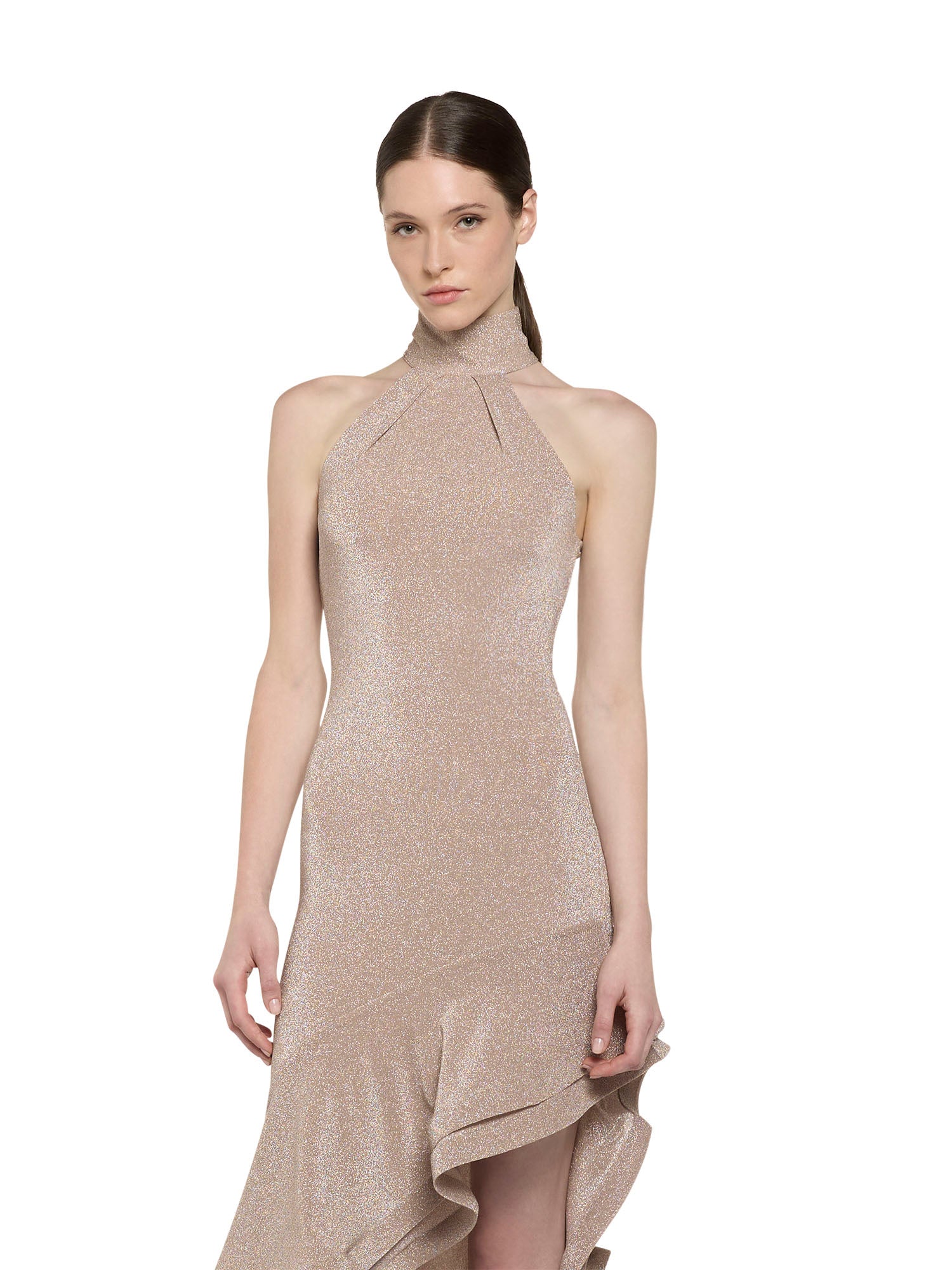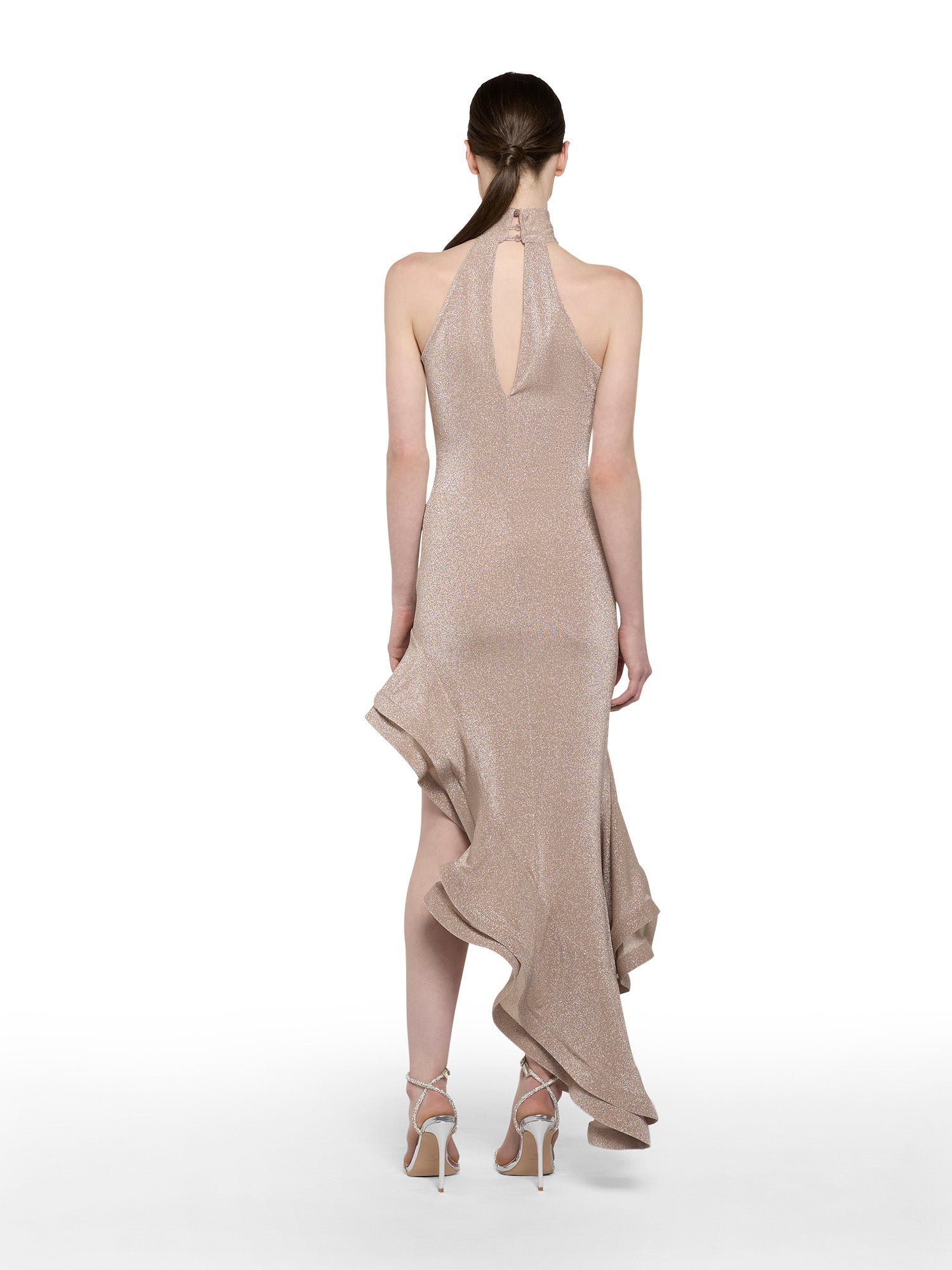 Abito lungo in jersey lurex con scollo all'americana e balza asimmetrica sul fondo. Finitura balza strutturata per creare un effetto svasato ed ondulato.
