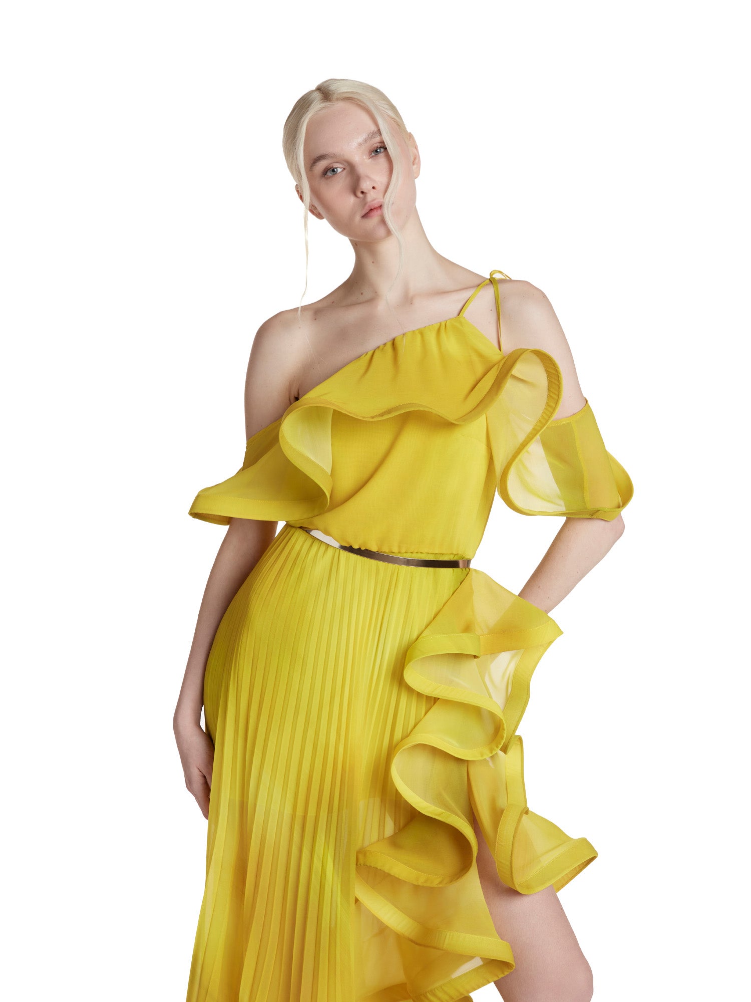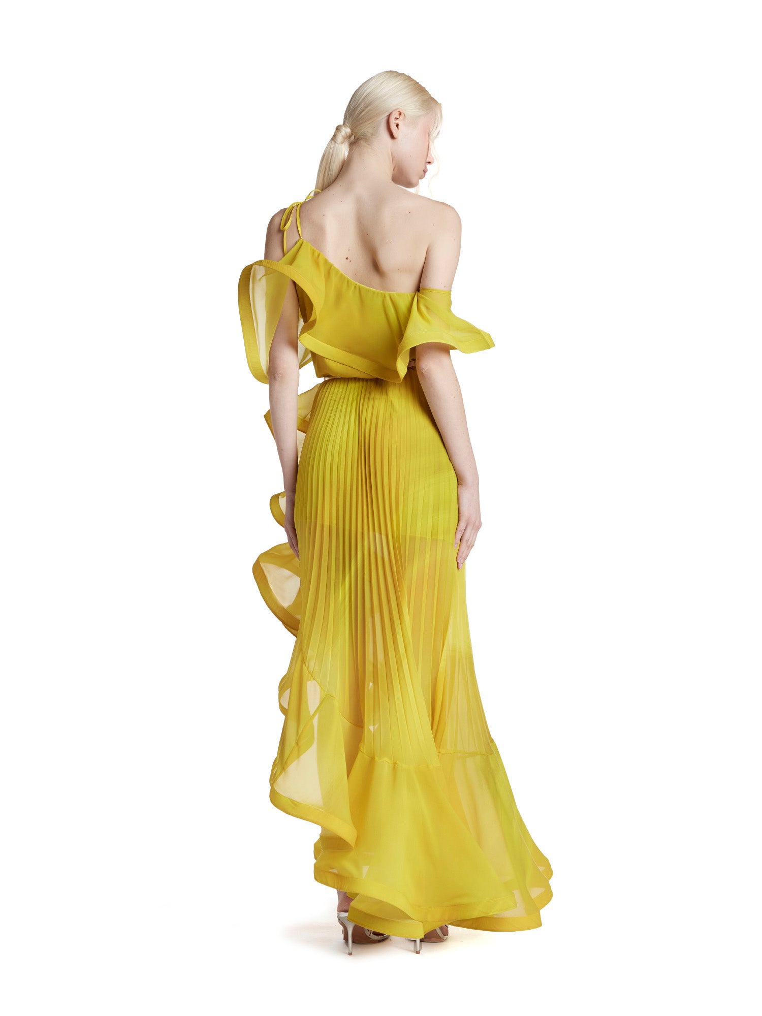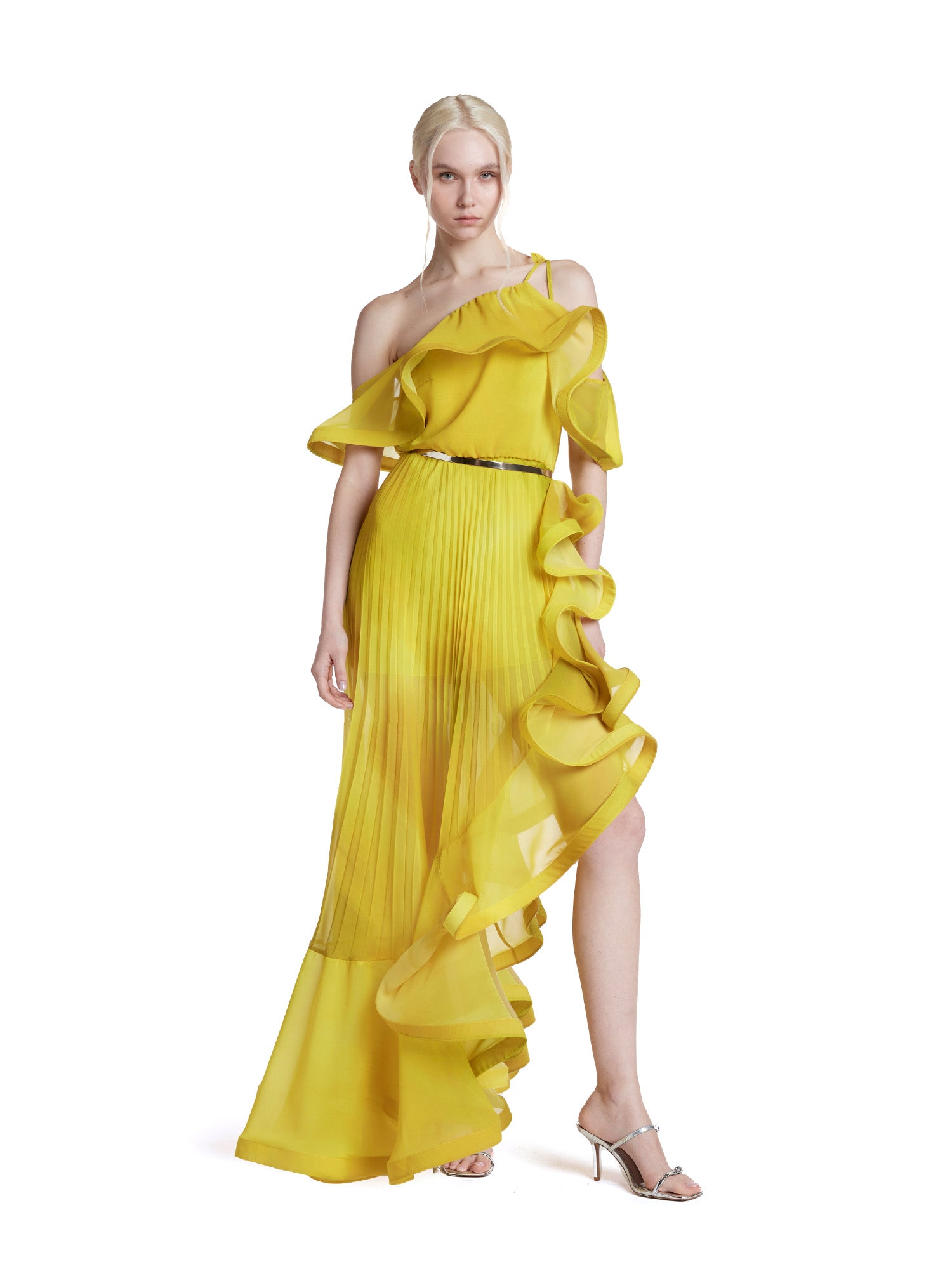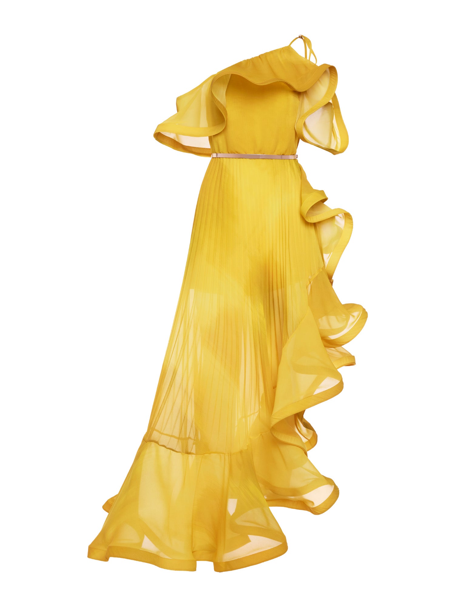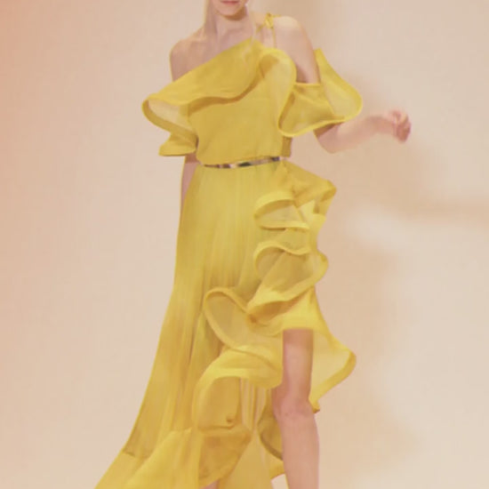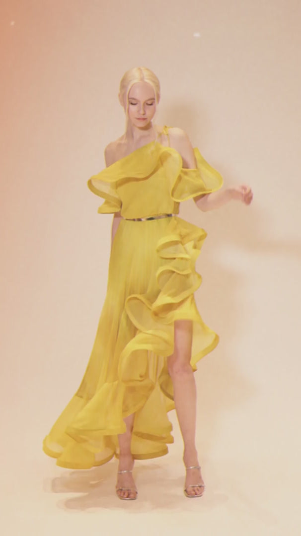 Abito lungo con volant e crinolina in chiffon stampa sfumata