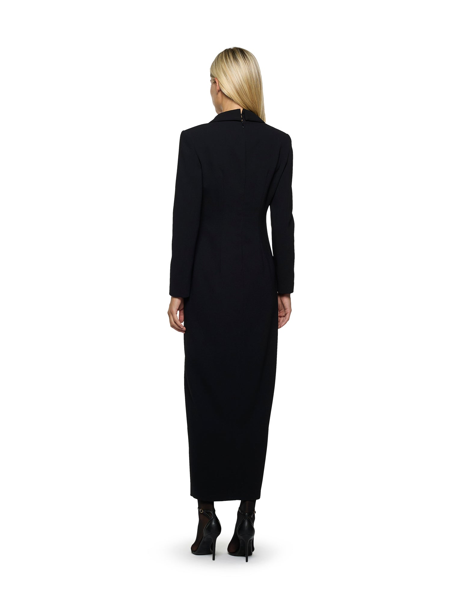 Abito lungo a manica lunga in enver satin con bottoni gioiello con cristalli. Revers larghi a punta e scollo profondo a V. Chiusura posteriore con zip nascosta. Vita aderente, spacco laterale ed orlo dritto.