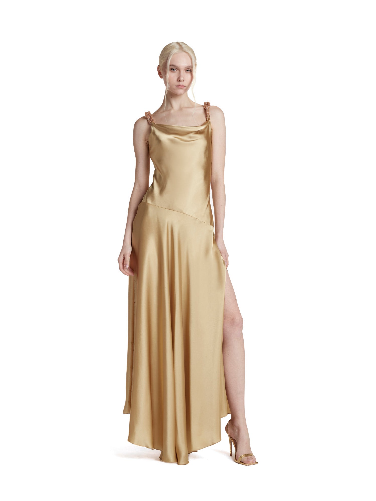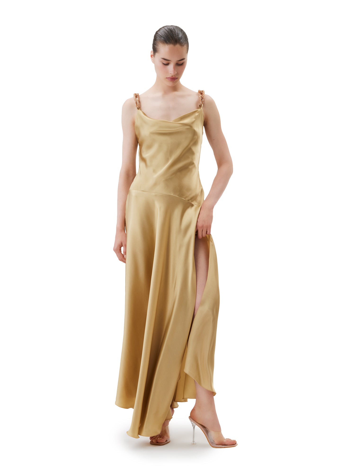 Abito lungo sottoveste in cupro con spacco